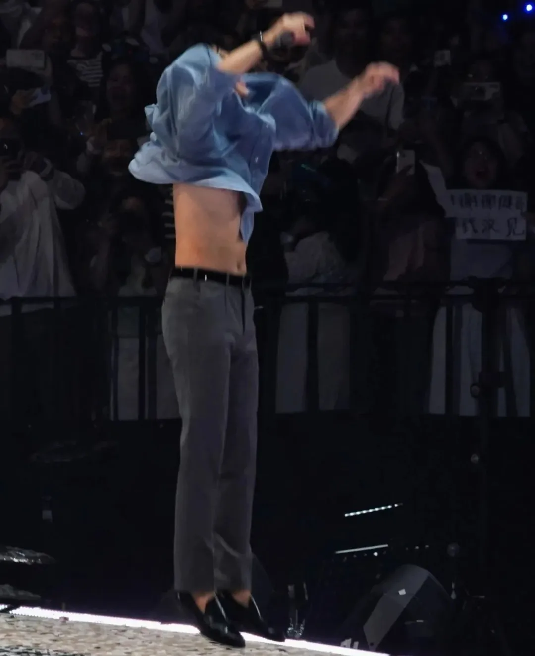 时隔几个月后的“万物安生时”巡回演唱会上,李健在谢幕之际忍不住纵身一跃,与粉丝进行互动。起身跳跃的瞬间,依旧可见其身材全然没有退步。就连环绕一圈的乐队老师见了,都忍不住赞叹。