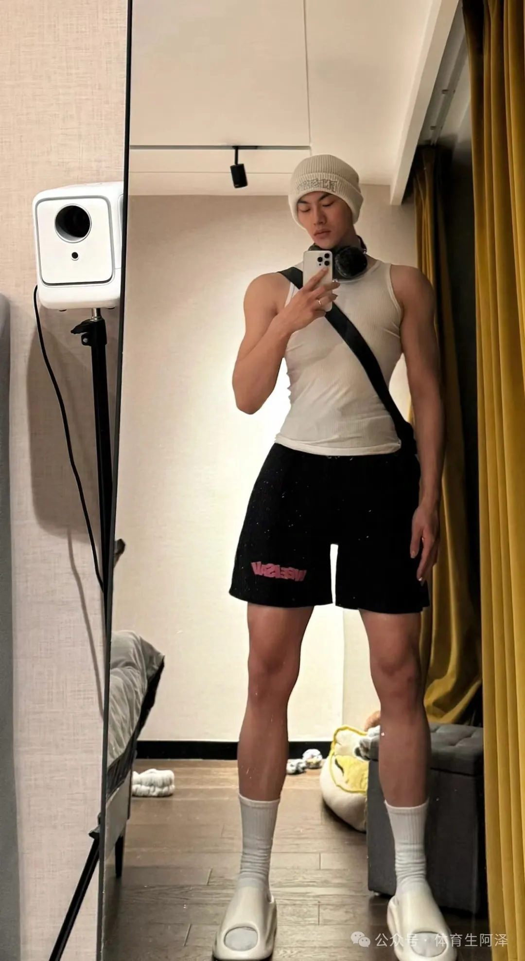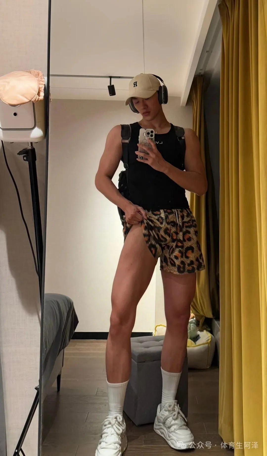 还有就是体育生的经典穿搭,白袜拖鞋加上黑皮的短裤。真的是非常的体育生了,看的出来这位体育生已经很卖力的在展示自己了哈哈哈哈。这不就是合并同类项嘛。谁家直男拍照把裤子拉这么高,专门显露这个粗壮的大腿啊啊哈哈哈哈。但是阿泽确实挺谗这个大腿的哈哈哈哈哈,想象一下这个粗壮的大腿在自己背后默默的支撑着自己,那得有多爽啊啊哈哈哈。