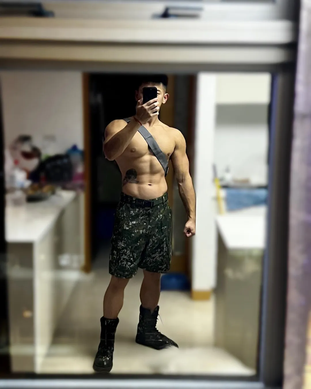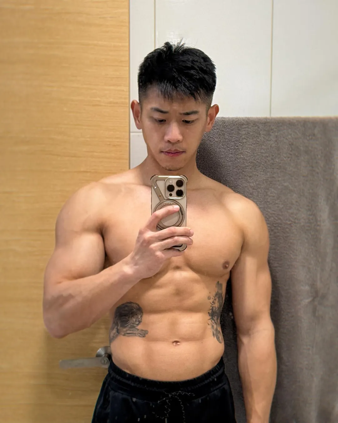 再说到他的腹肌,Leon 的肌肉雕刻技术真是了不得。他的腹肌不仅条理分明,还特意雕刻出一只“狮子”的形状。这样的腹肌光看着就让人心服口服,像极了电影里的动作男主角。关键是他的体脂低到离谱,这种细腻的腱划线,绝对不是随便练练就能练出来的。Leon 也在社交平台上分享过自己的训练细节,比如:每天的腹肌训练都坚持15分钟以上,动作简单但强度高,真是一点都不偷懒。
