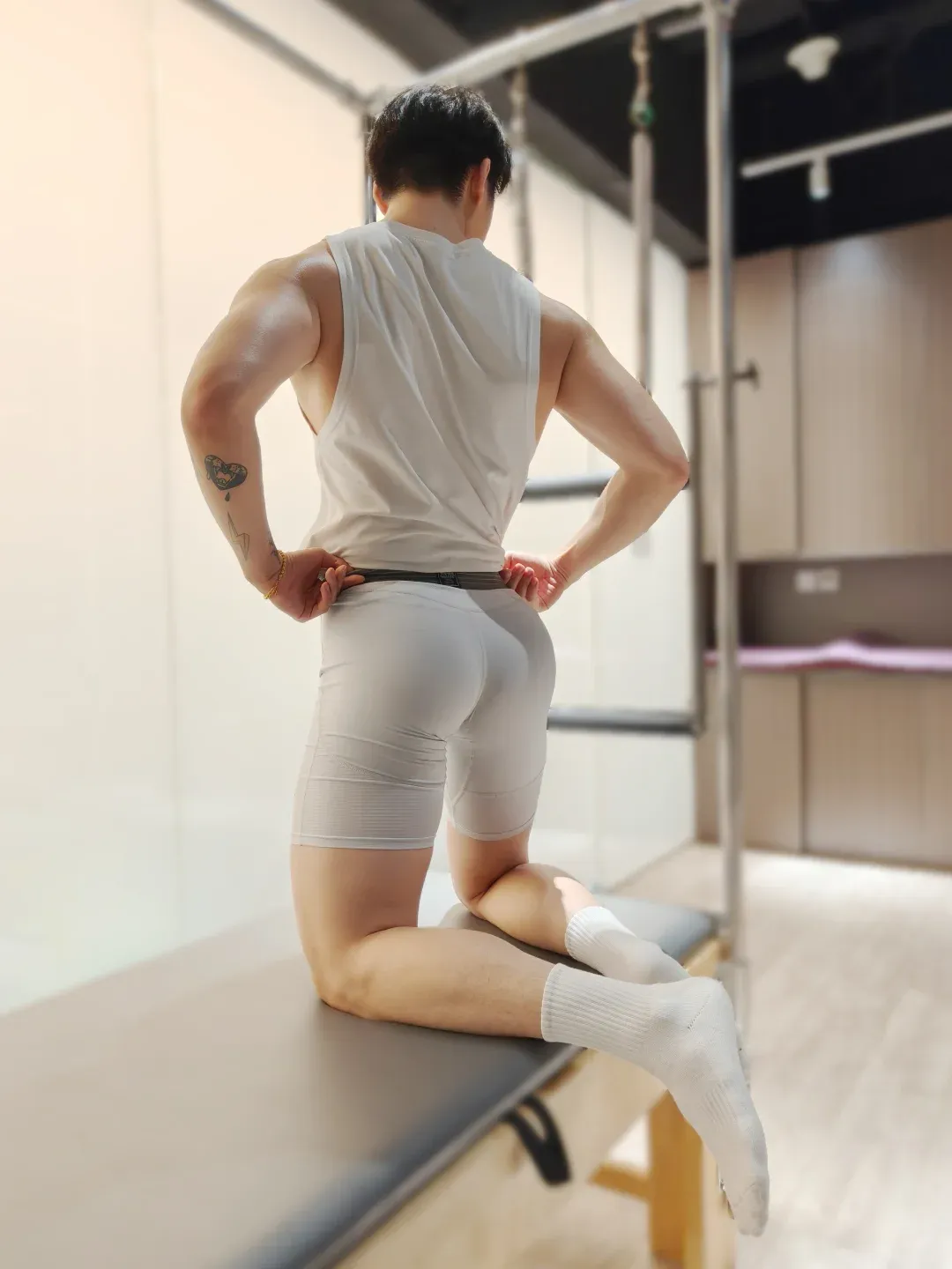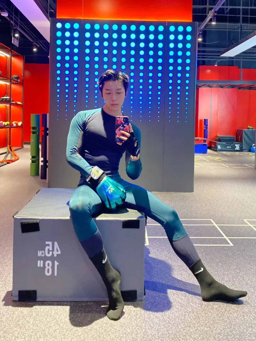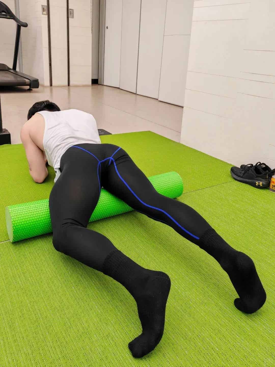 除了做常规的力量训练,他对拉伸运动也非常重视。尤其是在做各种高难度的拉伸动作时,他的身体柔韧度和肌肉的弹性,真的是让人羡慕不已。他常常穿着白袜子进行拉伸,修长的双腿在拉伸中展现出完美的曲线,仿佛每一个动作都在证明着他对自我的要求和追求。这种柔韧和弹性,才是他身材魅力的另一层次。