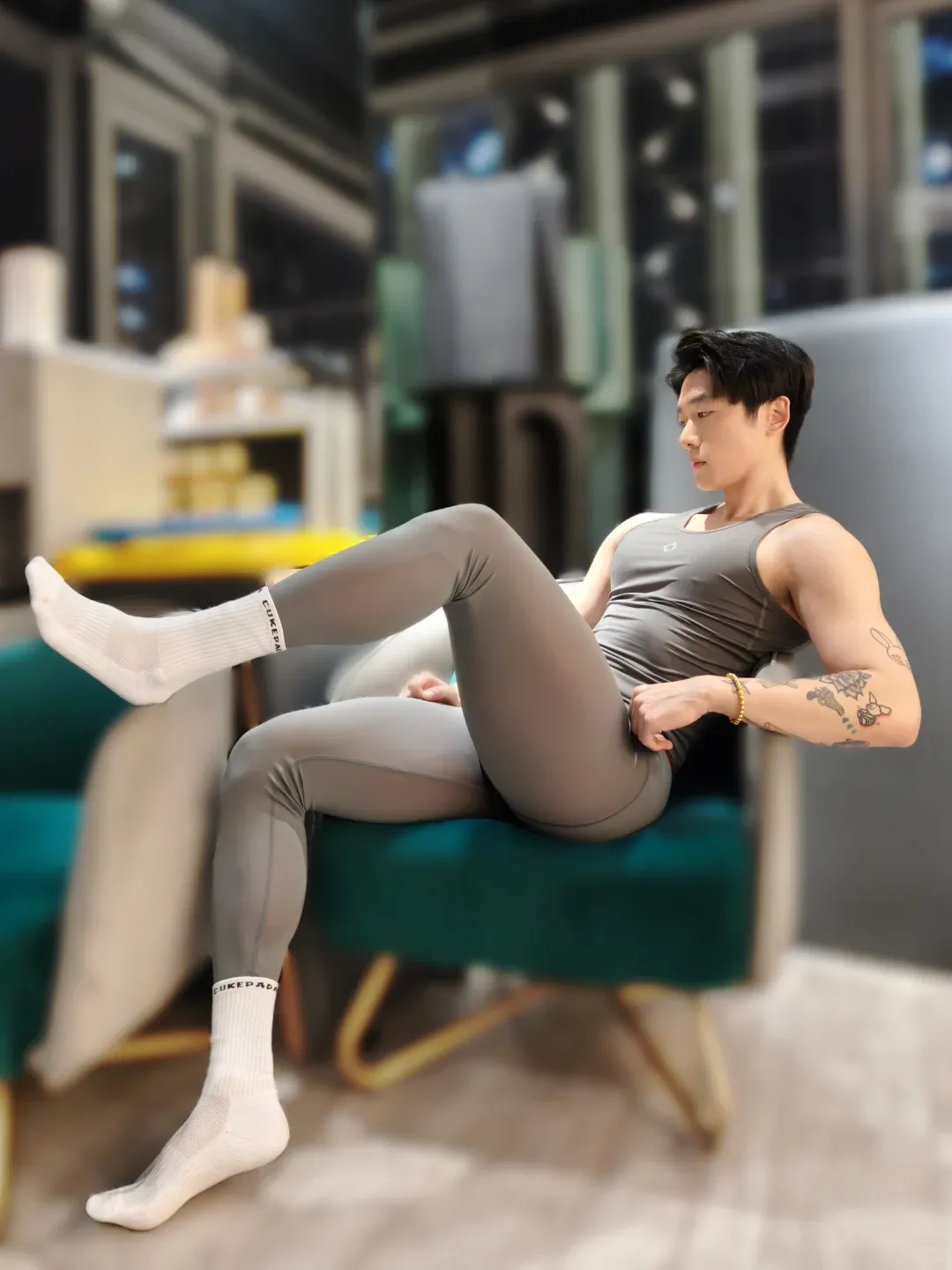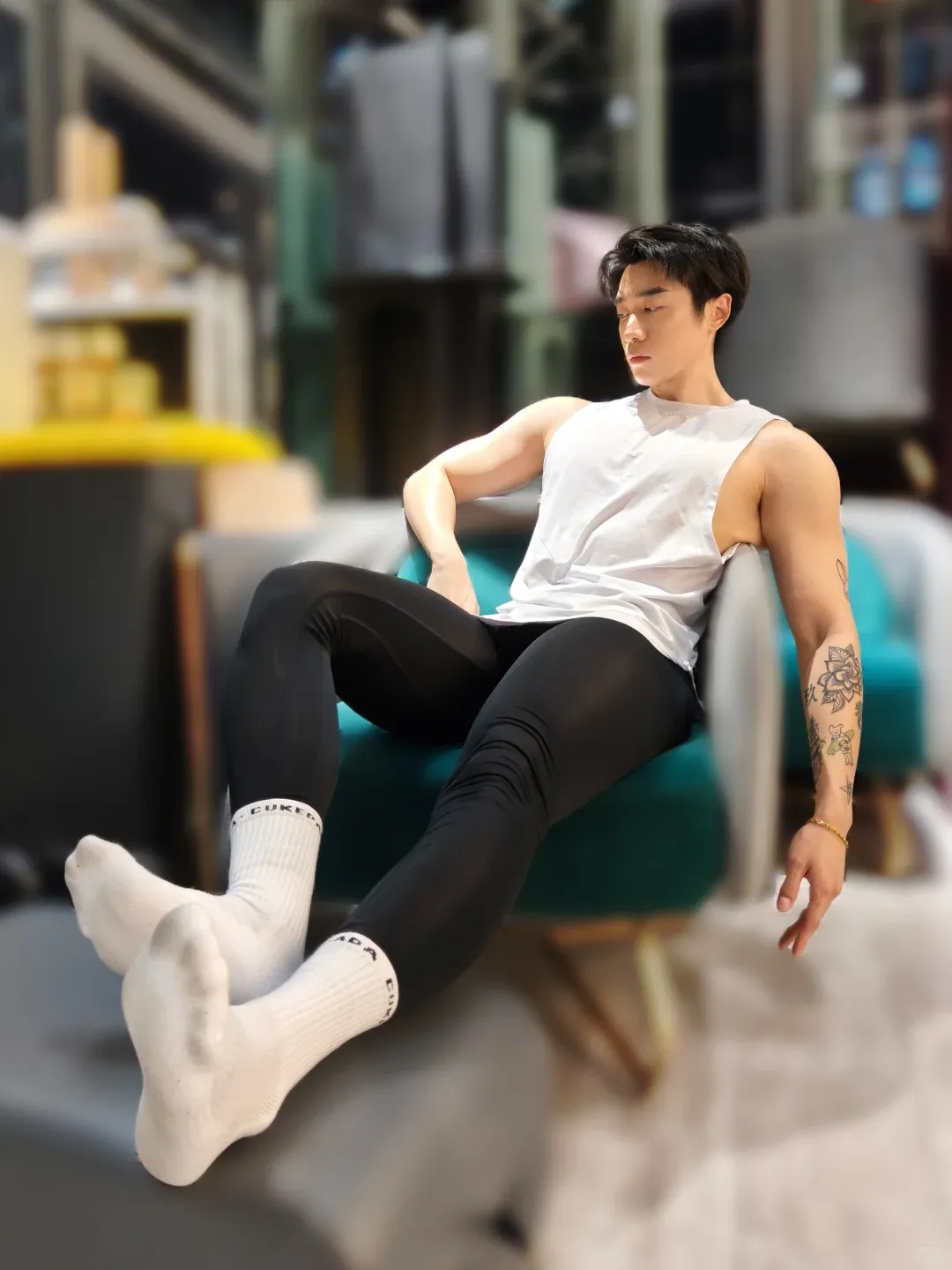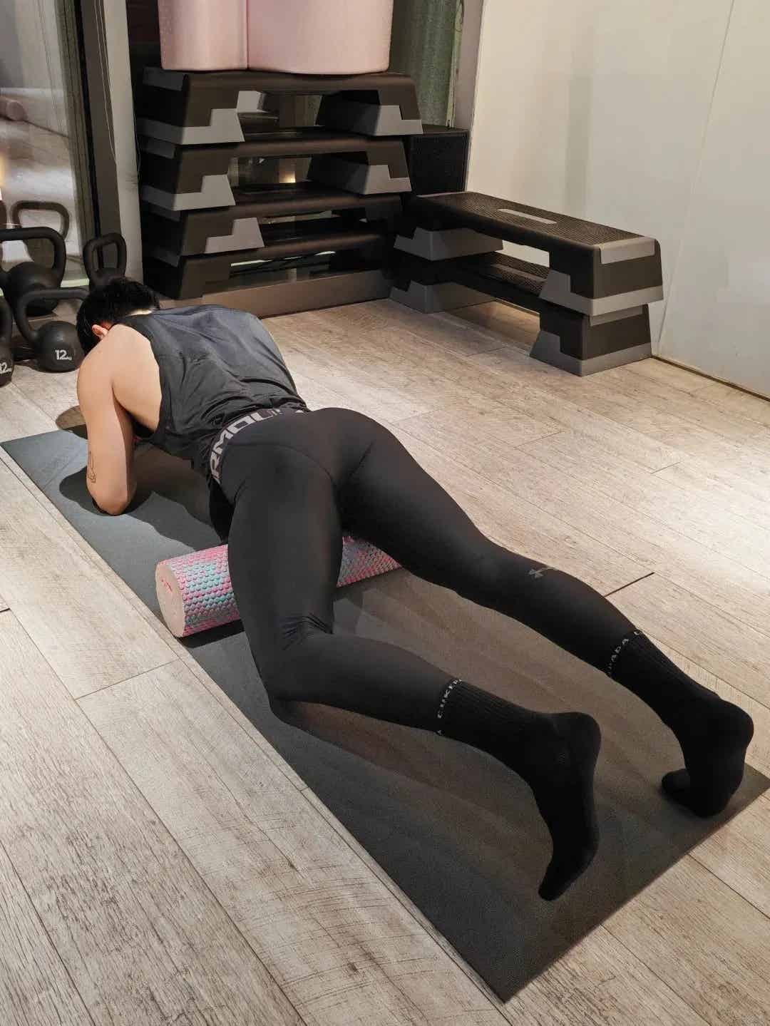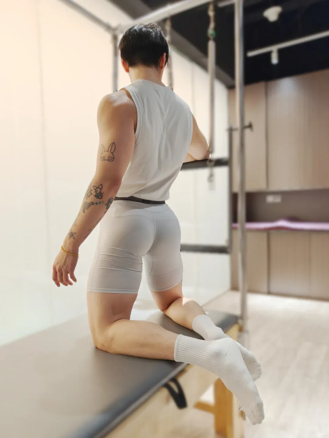 除了做常规的力量训练,他对拉伸运动也非常重视。尤其是在做各种高难度的拉伸动作时,他的身体柔韧度和肌肉的弹性,真的是让人羡慕不已。他常常穿着白袜子进行拉伸,修长的双腿在拉伸中展现出完美的曲线,仿佛每一个动作都在证明着他对自我的要求和追求。这种柔韧和弹性,才是他身材魅力的另一层次。