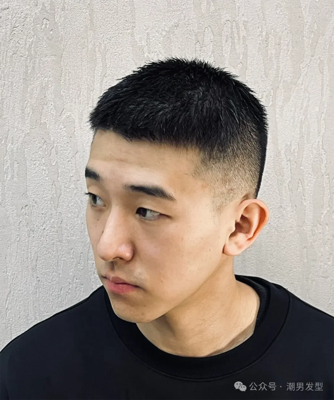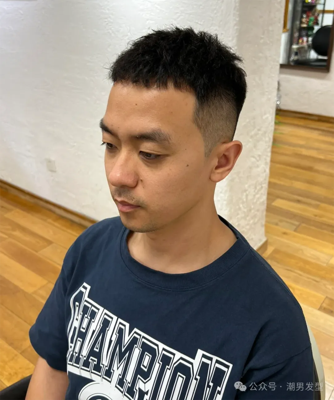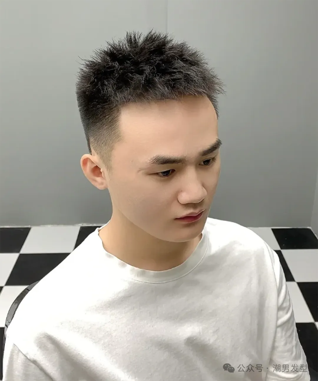 两边的头发通常都是渐层铲短,显得干净利落,层次感极强。再通过烫发的形式把头发烫出些纹理,可以增加头顶的蓬松度,打理造型的时候刘海稍微吹翘起,这样使得脸型更加立体,还显得特别个性帅气,时尚感满满!第三款:精简短发