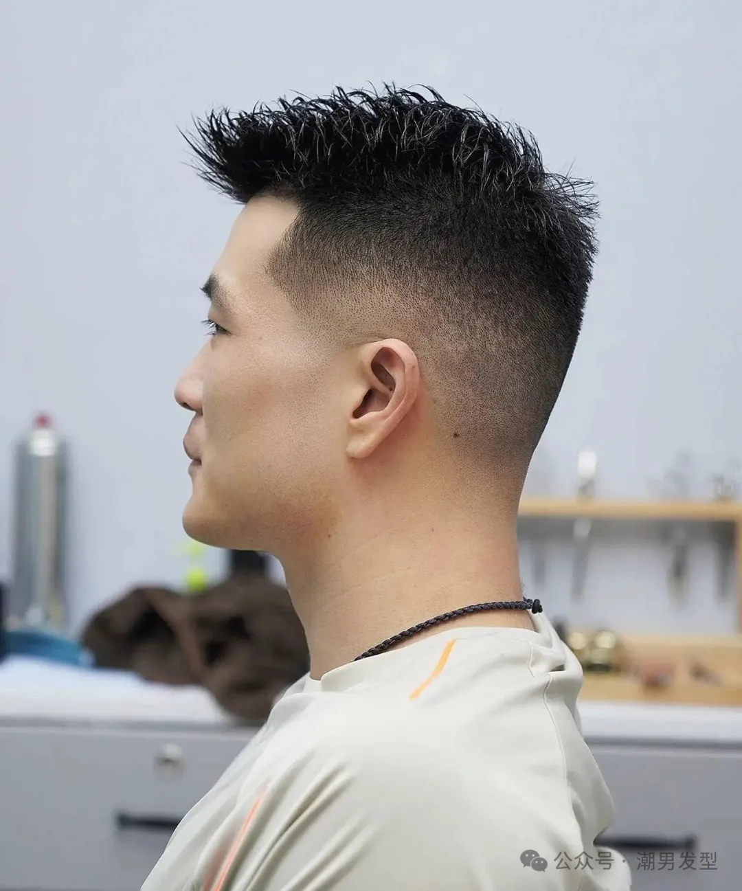 这款发型可是为发质粗硬的男生量身打造的。如果你觉得自己的头发难以打理的话,不妨试试这款发型;两边的头发渐层铲短,中间的头发则保留一定的长度,打理造型的时候把刘海打造出向前翘起的效果,这样的造型张扬又不失个性。无论是搭配休闲装还是正装,都能让你瞬间提升气质,走在街上,回头率绝对爆表!第三款:利落短发
