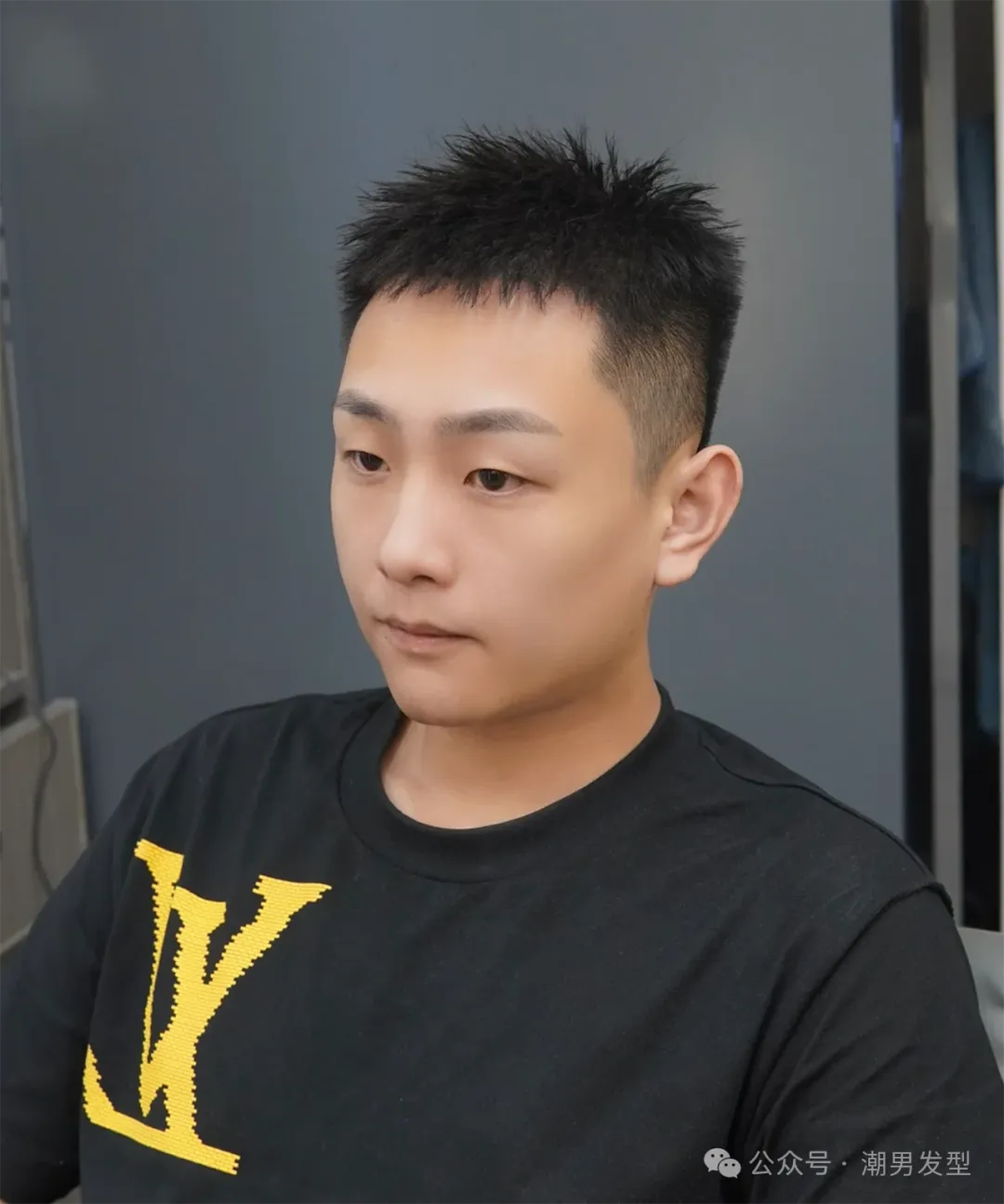 侧分短发给人的第一形象就是显精神、轻熟干练。两边的头发通过精心的裁剪,中间的头发保留一定的长度,这样使得上面和后边头发自然过渡,既有层次的落差,又能修饰额头和颧骨,打理造型的时候梳出侧分的效果,简单抓出些纹理感,这样整体造型看起来轻熟又帅气。而且这种发型让人看上去年轻、有朝气,同时不需要花费太多时间和精力进行打理。第三款:钢夹前刺发型 这也是一款比较个性的男士短发,对于一些发量稀疏、细软的男士也很合适,通过钢夹烫的方式把头发烫出些蓬松度,既可以增加头发的弹性,又可以增加头顶头发的高度,周边头发渐层剃短,从而让脸型看起来更有立体感,打理造型的时候刘海稍微吹翘起,这样整个发型看起时尚有型,简约又大气。第四款:寸头发型