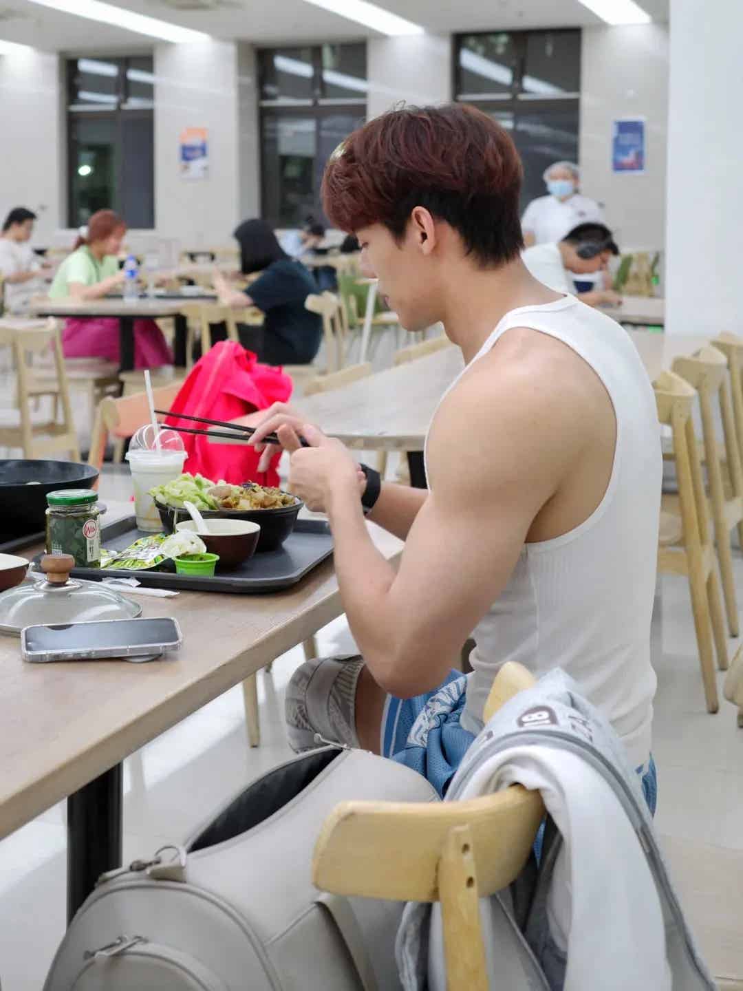 炙热的训练,让他每次从操场冲向食堂,都带着满身的大汗,而他一身的训练服甚至来不及脱,就迫不及待地冲向美味的食堂,这种画面你敢信?!