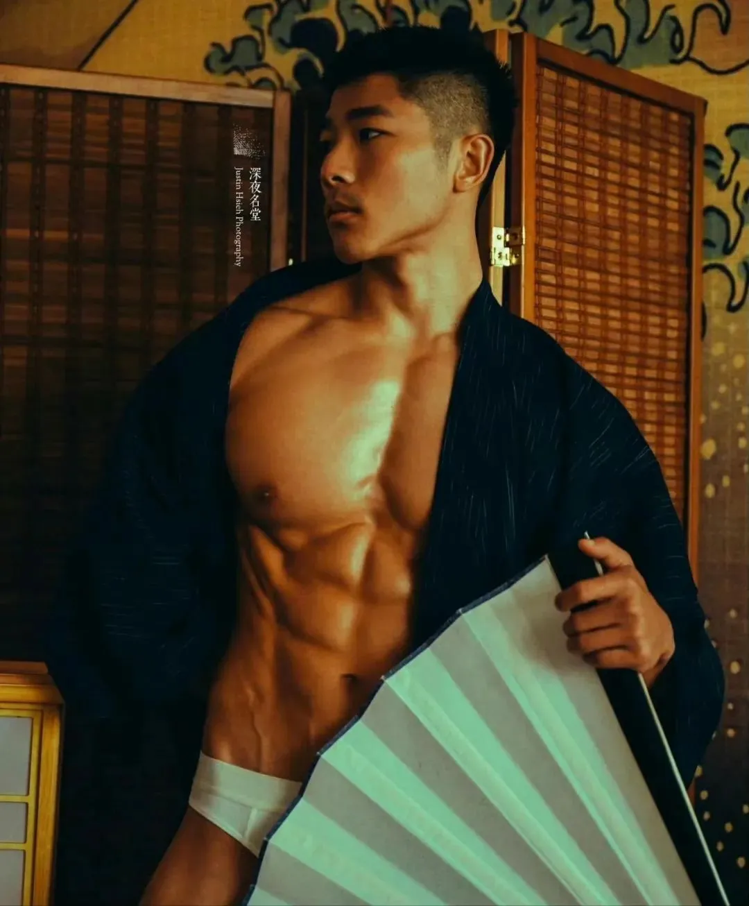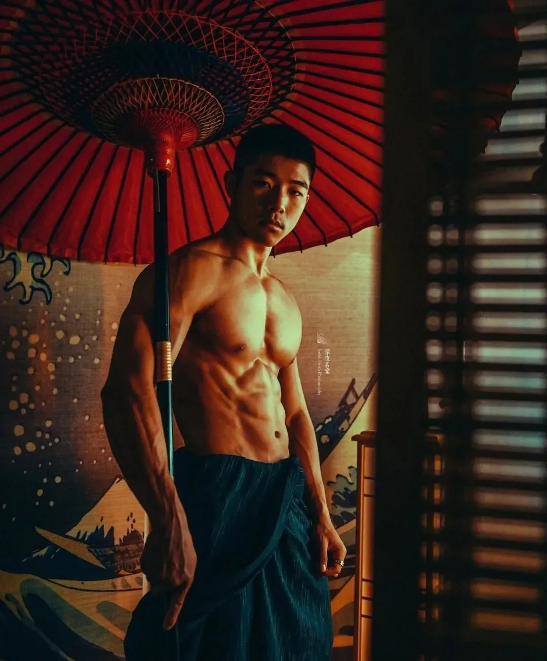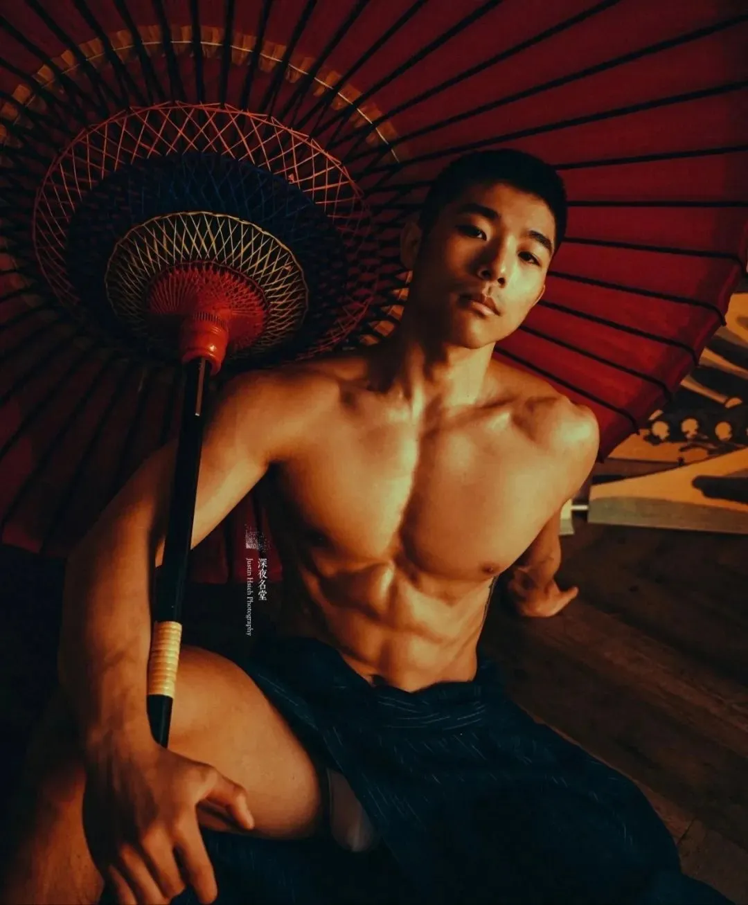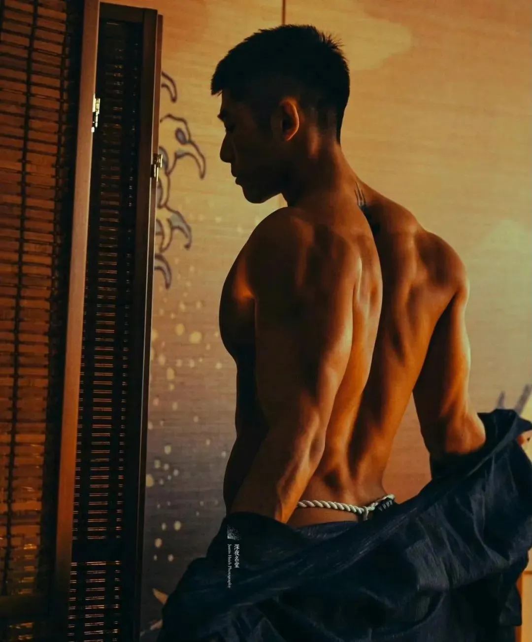 深夜名堂工作室的镜头切开台北潮湿的夜色时,王浩权古铜色的皮肤正在吞噬所有的光。这具被3000次深蹲雕刻出的臀肌,在黑色天鹅绒背景上勾勒出某种介于青铜器与健身补剂广告之间的轮廓——当江南油纸伞的竹骨阴影斜切过他的人鱼线,我们突然意识到:当代男色消费正在经历一场静默的东方文艺复兴。