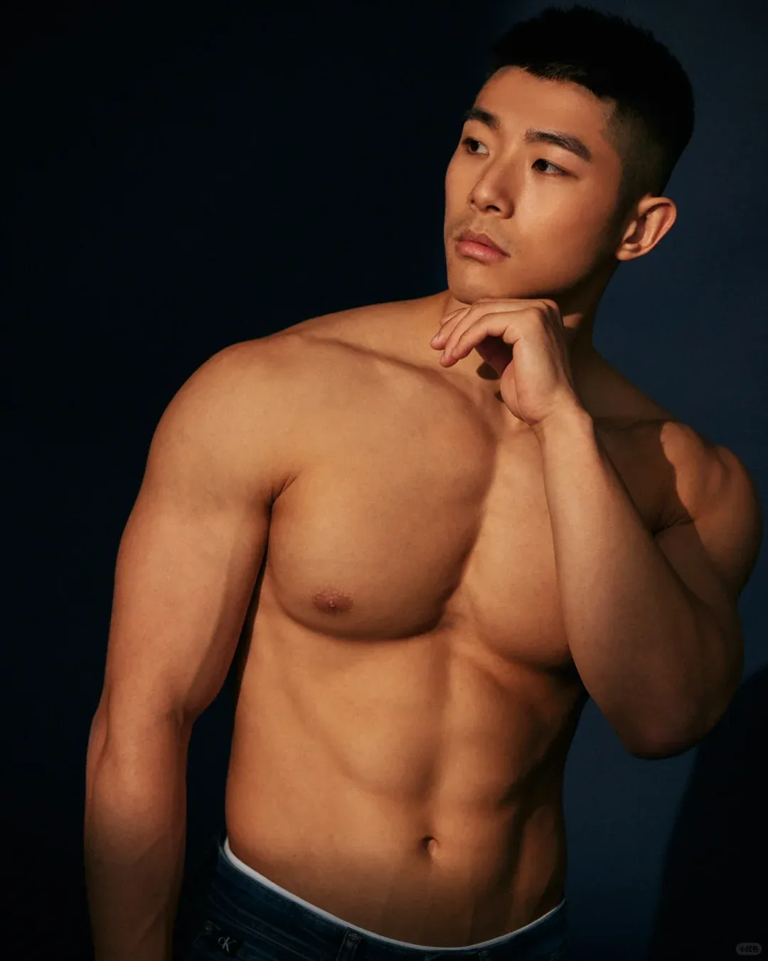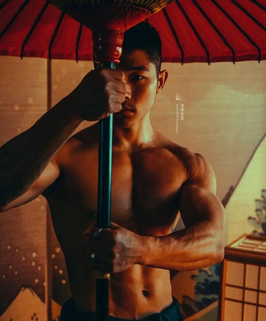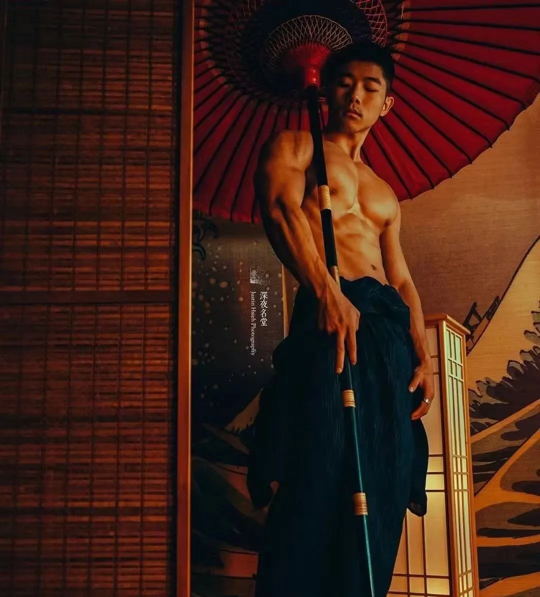 深夜名堂工作室的镜头切开台北潮湿的夜色时,王浩权古铜色的皮肤正在吞噬所有的光。这具被3000次深蹲雕刻出的臀肌,在黑色天鹅绒背景上勾勒出某种介于青铜器与健身补剂广告之间的轮廓——当江南油纸伞的竹骨阴影斜切过他的人鱼线,我们突然意识到:当代男色消费正在经历一场静默的东方文艺复兴。