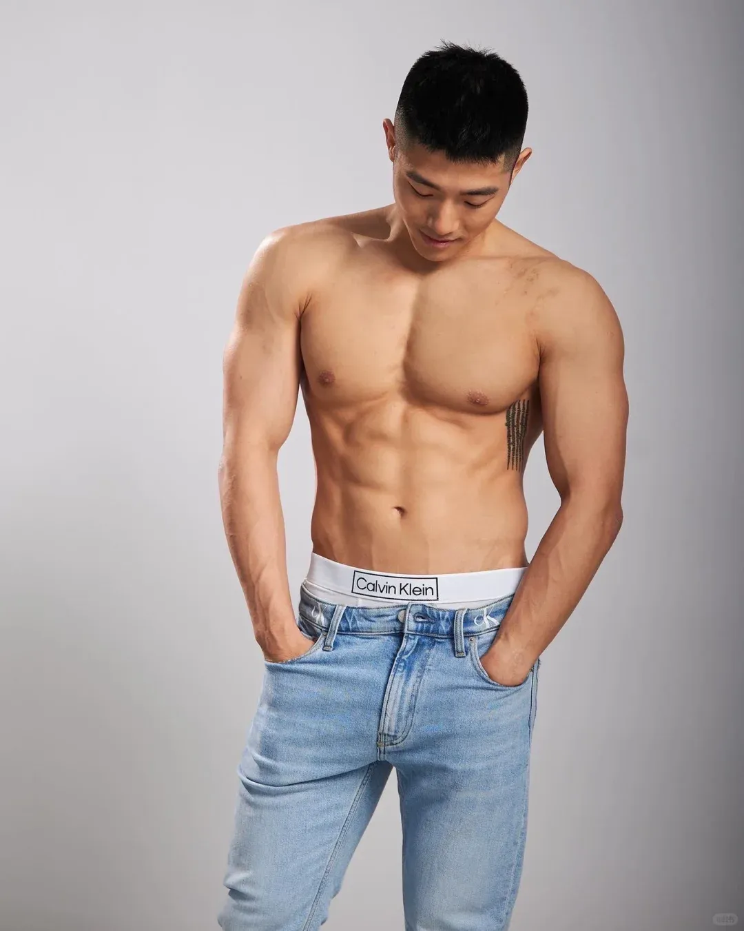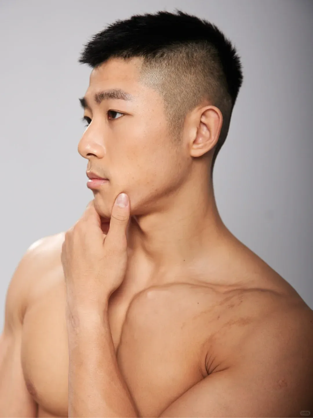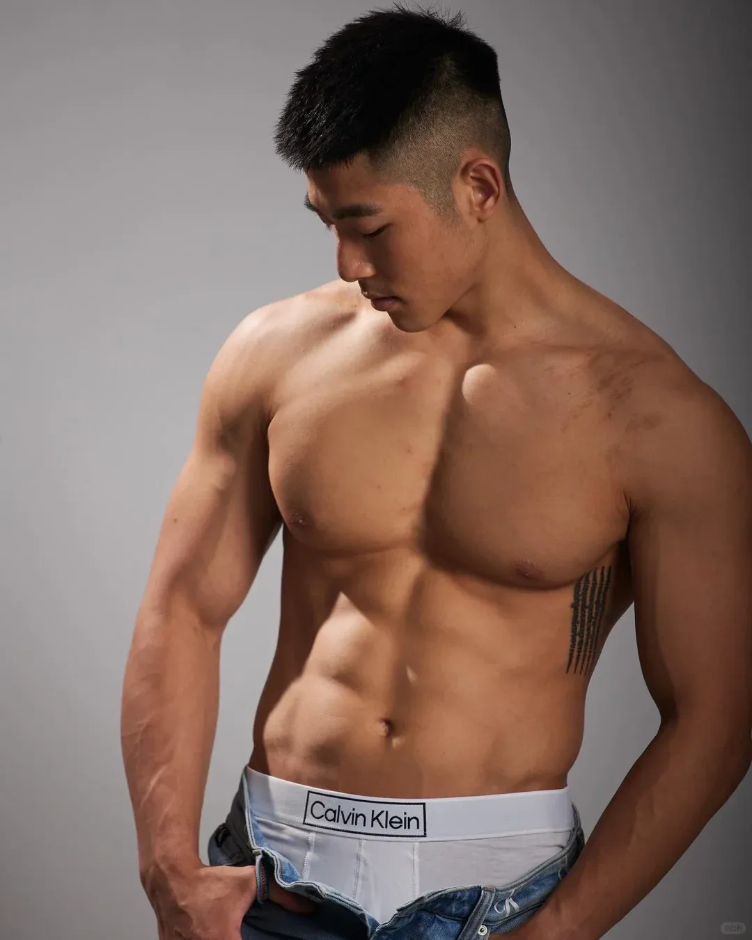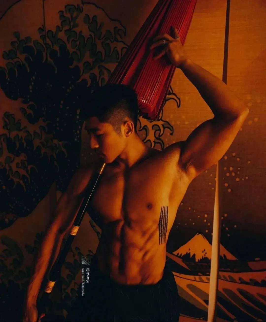 深夜名堂工作室的镜头切开台北潮湿的夜色时,王浩权古铜色的皮肤正在吞噬所有的光。这具被3000次深蹲雕刻出的臀肌,在黑色天鹅绒背景上勾勒出某种介于青铜器与健身补剂广告之间的轮廓——当江南油纸伞的竹骨阴影斜切过他的人鱼线,我们突然意识到:当代男色消费正在经历一场静默的东方文艺复兴。