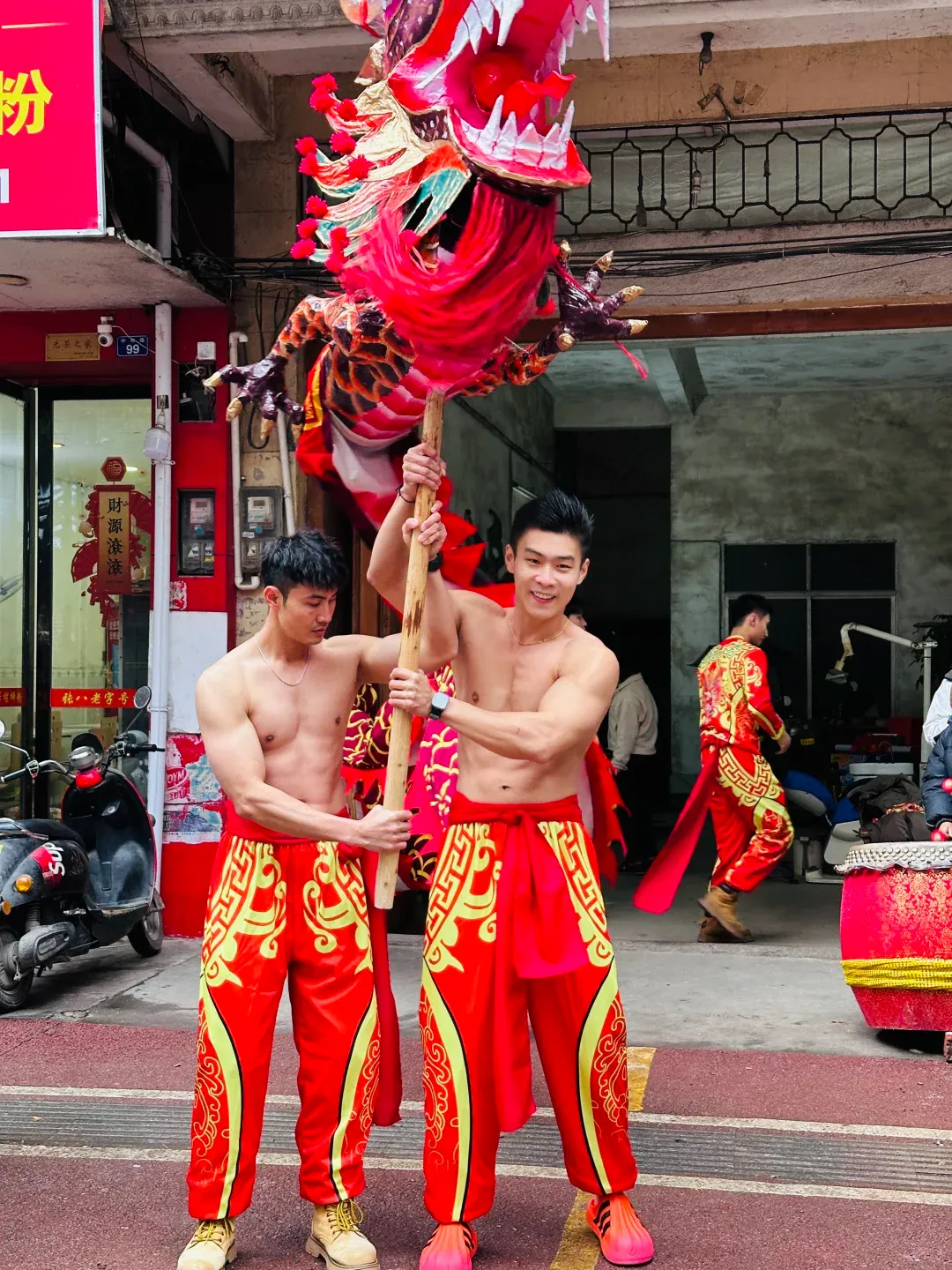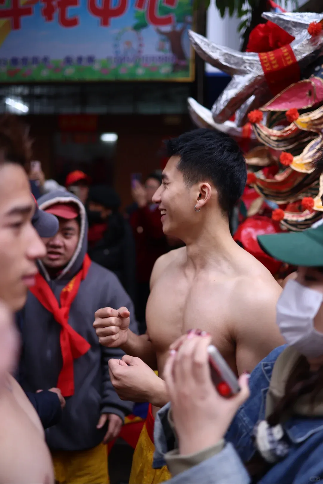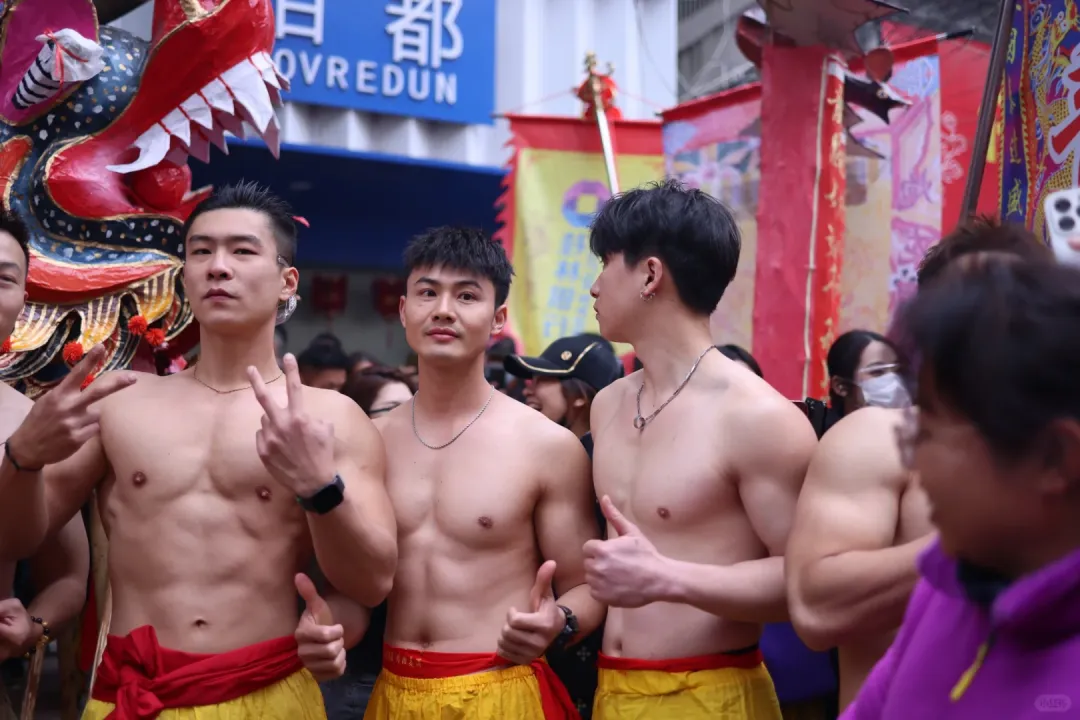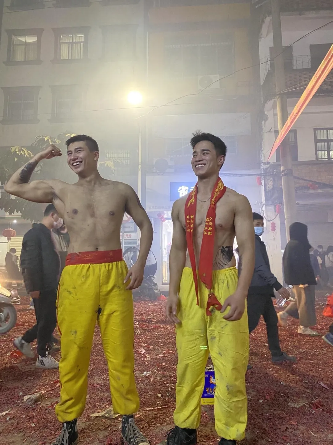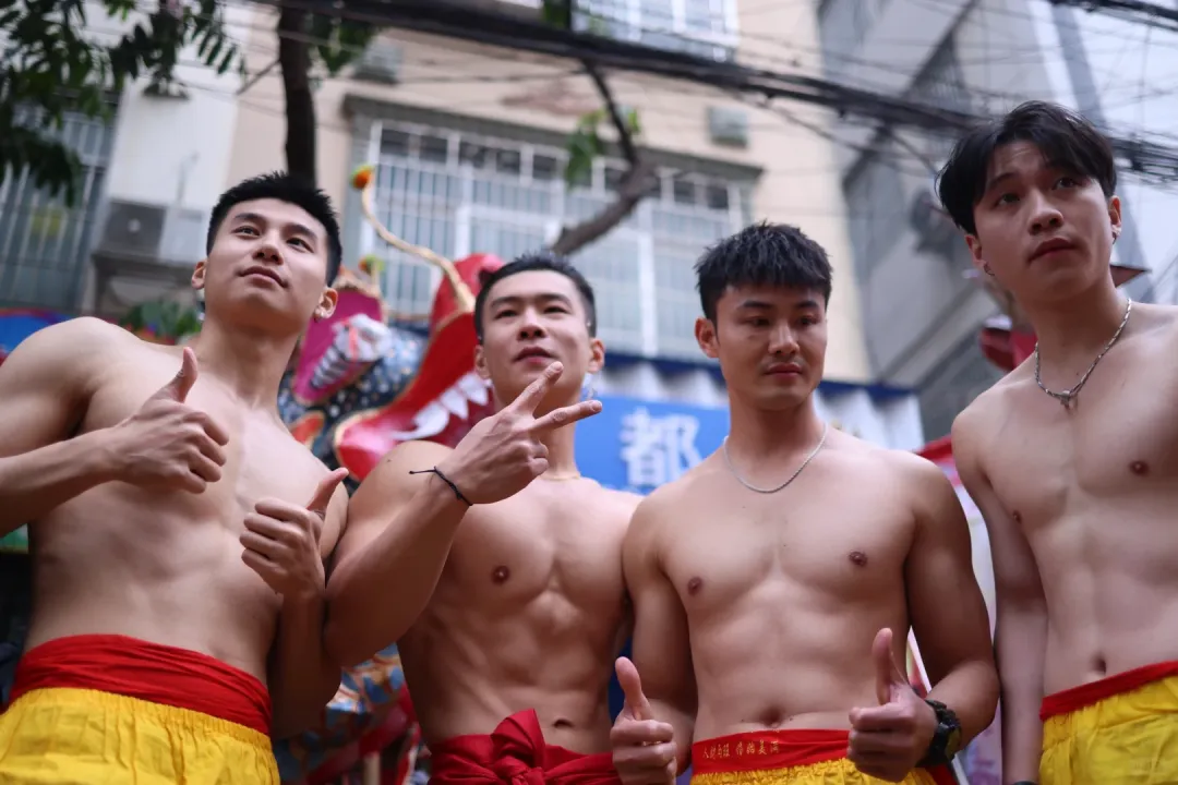 想象一下,街道上弥漫着鞭炮的烟雾,刺鼻却又充满着兴奋的气息。在这烟雾缭绕之中,一群光着膀子的小哥哥们开始舞动炮龙。他们的肌肉线条分明,每一块肌肉都像是蕴含着无尽的力量。他们在烟雾中若隐若现,如同神话中的勇士降临人间。这些小哥哥们,或许是当地的青年才俊,又或许是从远方归来的游子,但在这一刻,他们都化身为炮龙的驾驭者。