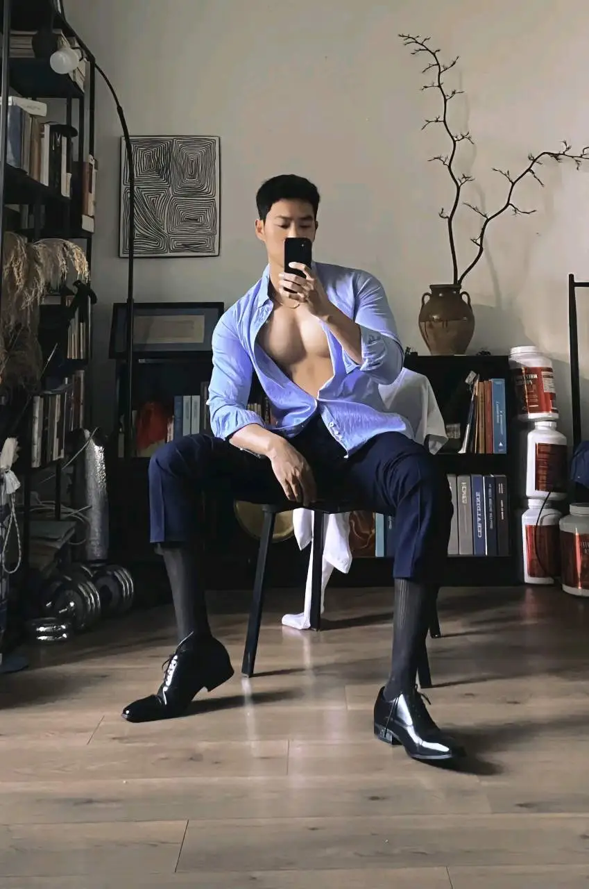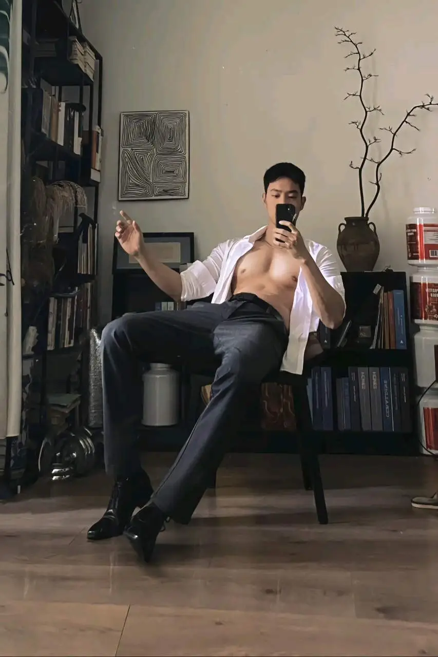 三、白衬衫才是隐形战袍宝子们总问健身男孩穿衬衫显壮怎么办,记住三点:袖笼要够大但袖口要紧,第二颗纽扣永远敞开,衣长不能盖过臀部中线。最近发现个宝藏穿法——把下摆塞进裤腰后轻轻扯出两指宽余量,坐下时腹肌线条比直接露肉更勾人。