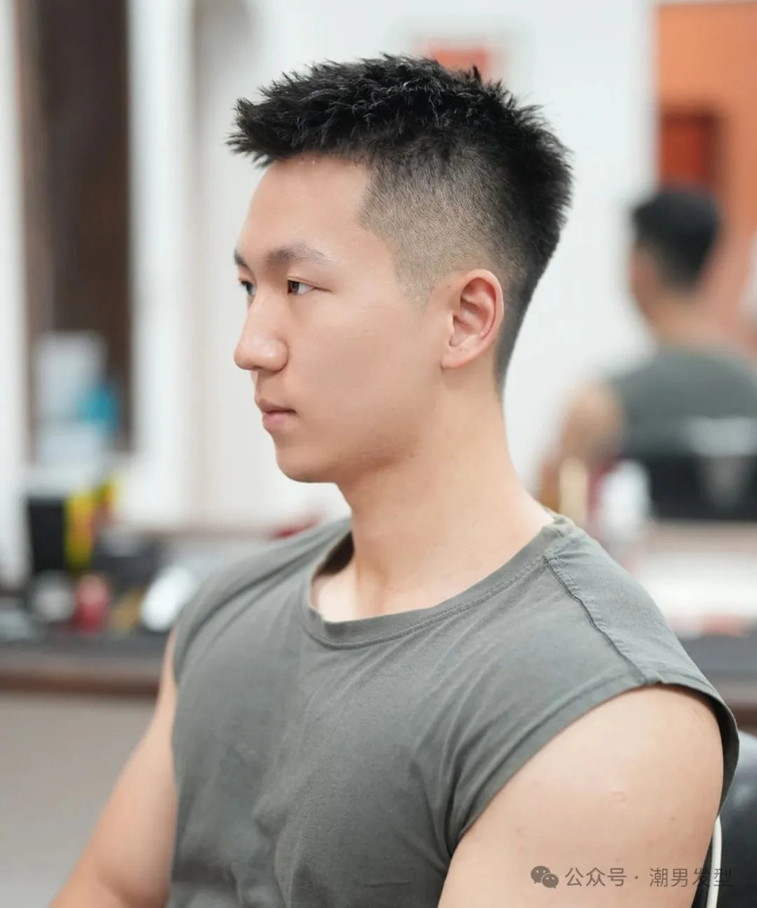 这款发型也可以说是寸头发型的进阶版,如果说你觉得寸头发型太短的话,那么这款渐变短发也是不错的选择,周边的头发推出渐变的效果,上面的头发也剪得极短,不仅可以让头部轮廓更显清晰,而且还增添了一份时尚感,这样的造型不仅打理简单,而且还显得简洁利落,尽显阳光帅气!第三款:短前刺 前刺发型是这几年比较流行的一款男生个性造型,不仅容易打理,而且也超级百搭。两边的头发渐层铲短或者掏空,上面的头发及刘海保留一定的长度,鬓角也修缮一番,再把刘海打理出前刺的的效果,并且抓出些凌乱感或者纹理感,这样的造型突出精致五官的同时,也显得硬朗帅气,还具有满满的时尚感!照片素材摘自网络,如侵权立即删除!只做发型分享,并没恶意!
