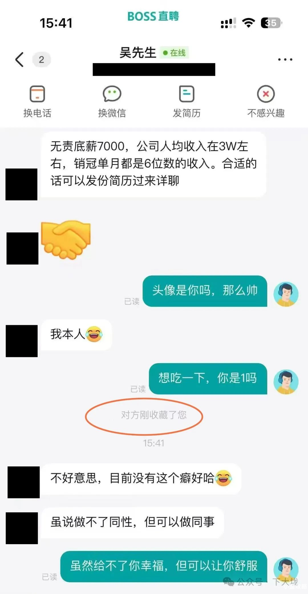 吴先生说,如果该基友觉得合适的话,可以发一份简历过去。然而,该基友似乎并不关注这份高薪工作的具体内容是什么,他被吴先生的头像给吸引住了。于是,立马询问头像是否为吴先生本人,还称赞吴先生的头像很帅气。