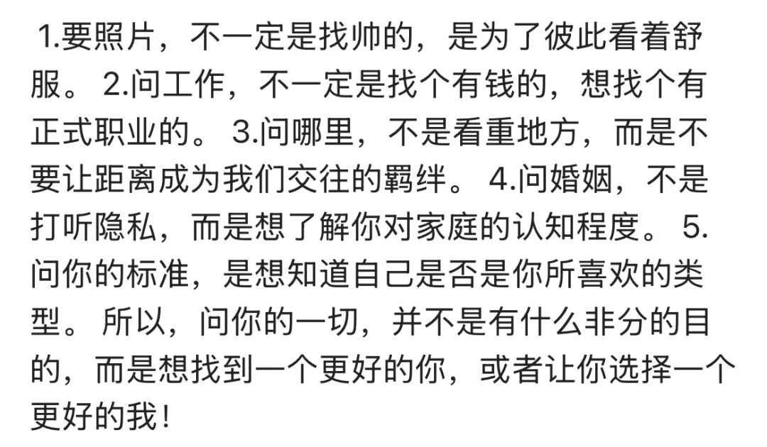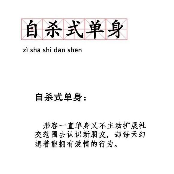 虽然以上都挺搞笑的,可是最触动我的还是第6条【自杀式单身】,很多时候我们都渴望拥有另一半,但是总是活在过去的人和事里,不愿意去接触新的人,更用耐心去和别人建立深层次的关系,以至于3年、5年过去了,一直在原地打转。