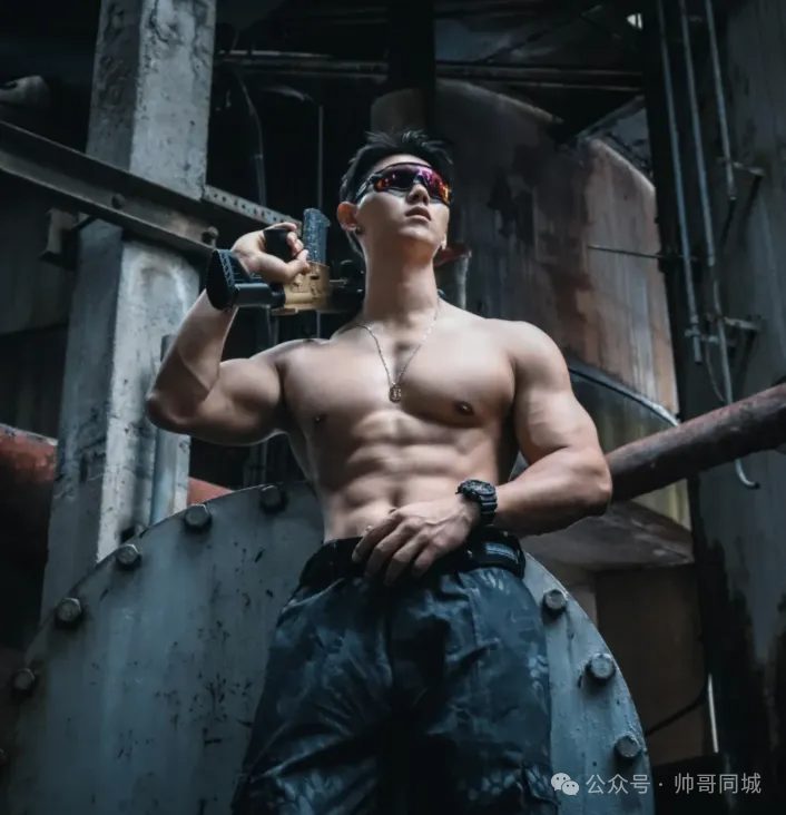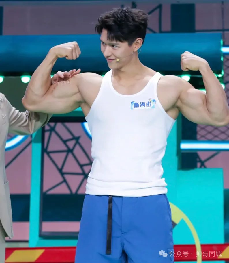 寸头下压着锋利眉骨,笑起来却露出两颗虎牙;暴起的肱二头肌撑裂袖口,腿部肌肉纤维如钢索绞紧。当他绷紧背肌如振翅鹰隼时,连主持人都调侃:「你这肌肉是发动机吗?」