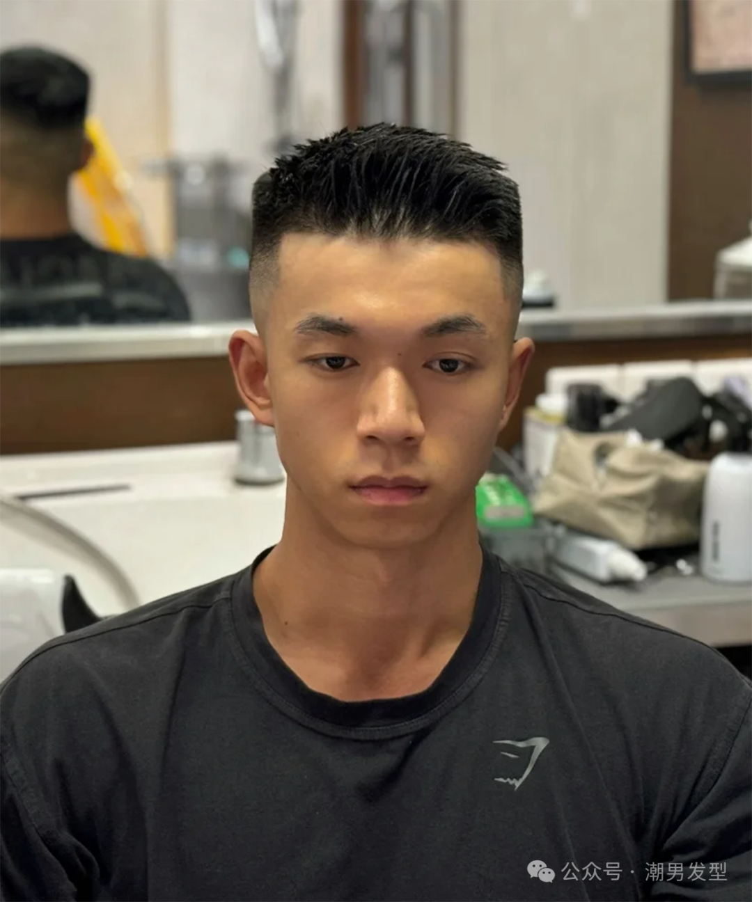 对于哪些不怎么会打理造型的男生来说,像上面这种美式露额短发也特别值得尝试,两侧和后面的头发渐层剃短,顶区的头发可以和理发师沟通好再保留,不要打薄,打理造型的时候刘海梳起来,并且抓出些纹理,再喷点发胶定型,这样的造型在露出精致五官的同时,整体造型也显得特别精神帅气。