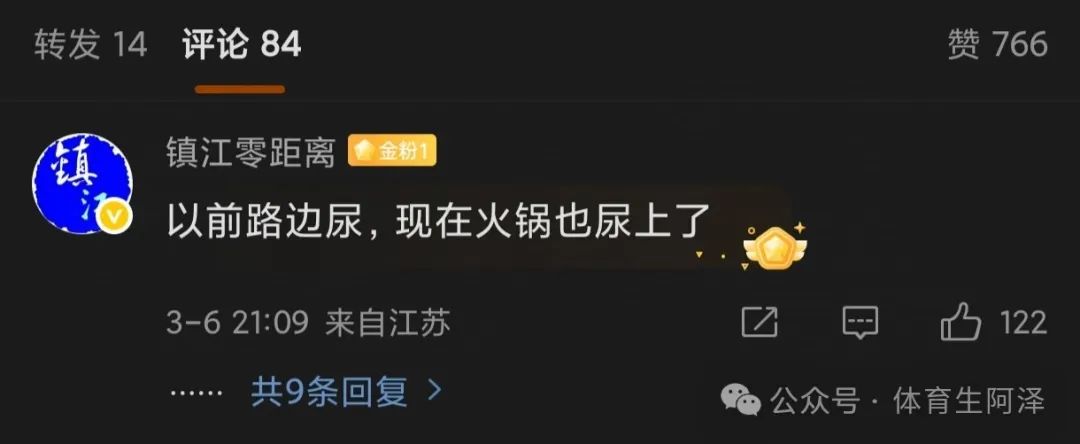 大神也开始了指责:“以前路边尿,现在火锅也尿上了”。就冲这个话阿泽也是点上了赞。真的回想到了以前的场景,半夜回家的时候,因为训练很晚,然后在小路上走着,突然看到一个男的在电线杆那里抖,我还以为是被电到了。于是赶紧找旁边有没有什么树枝,然后使劲冲过去将他撞倒,没想到。回头就给我一顿骂,看见他裤子没来的及提上的时候,阿泽瞬间明白了。真的是气的阿泽回去一个人生了好久的闷气啊!