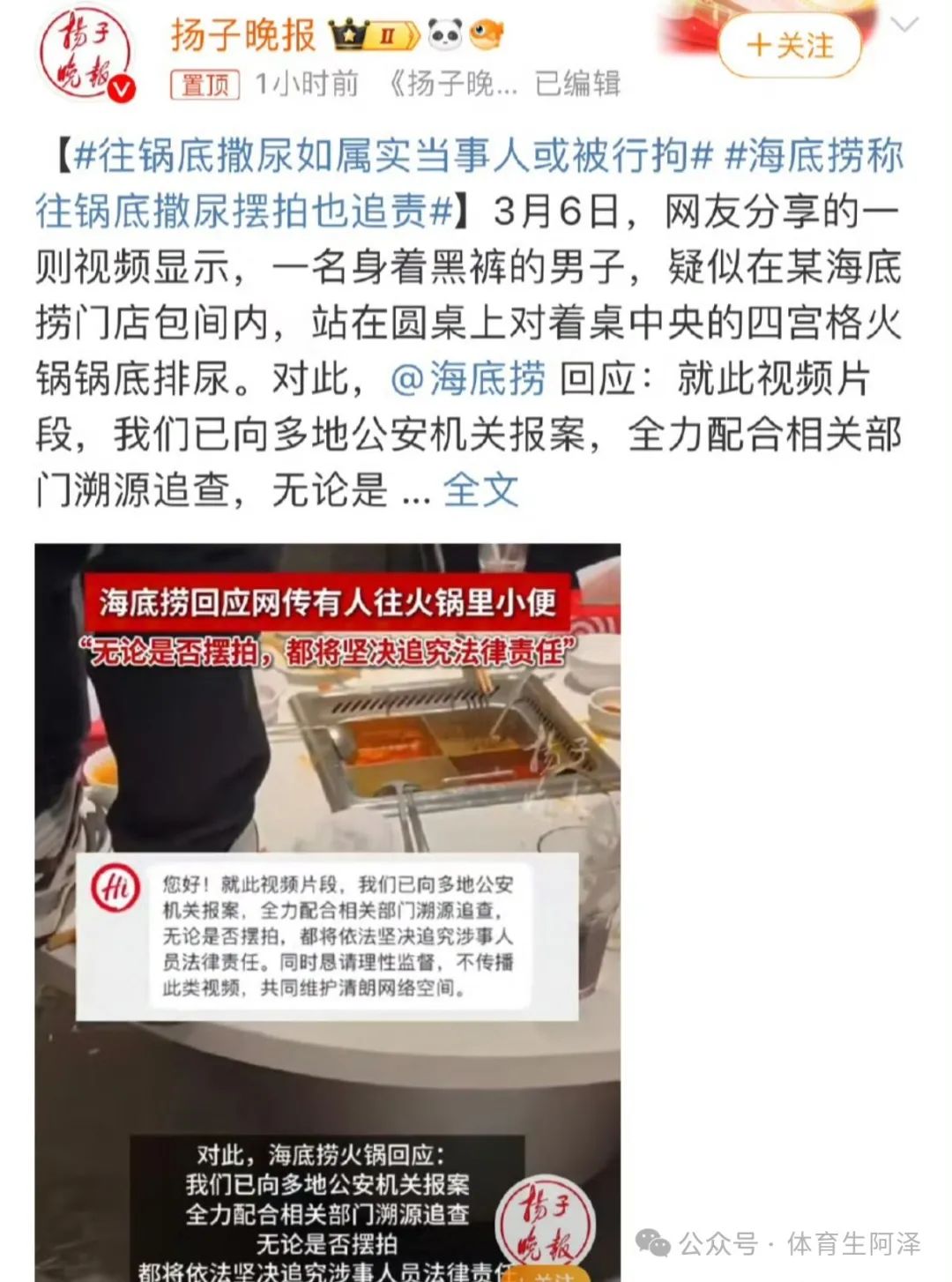 海底捞一男子站桌上往锅底撒尿,视频被流出,官方回应:已被刑拘.......