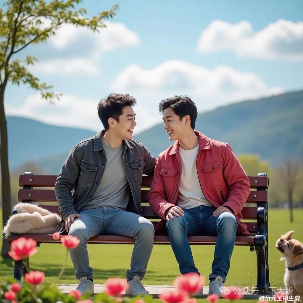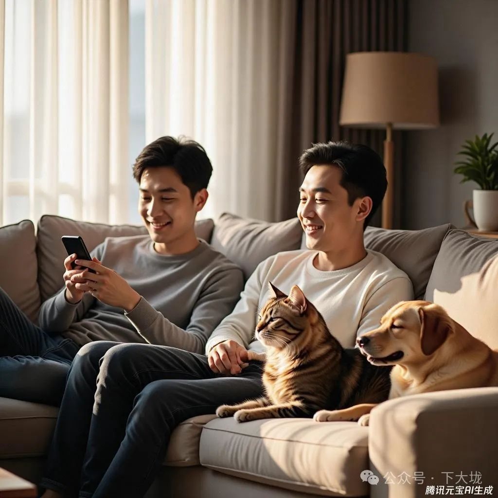 提示词:请画出2个中国男人(30岁)在家里的同居生活场景,他们坐在沙发上,一个人在玩手机,另外一个人在看电视,他们的身旁还躺着一只猫和一条狗。