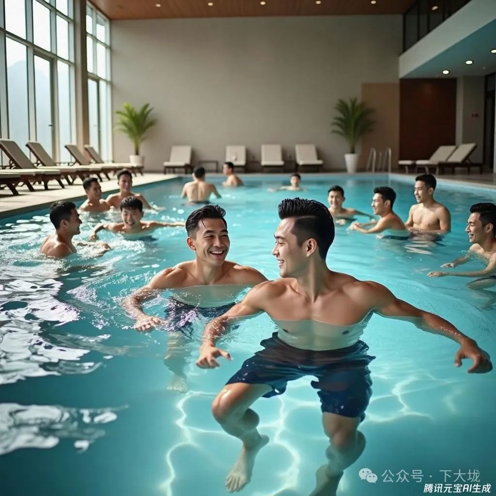 提示词:在一家室内游泳池内,一群中国的肌肉男正在游泳,他们有说有笑。
