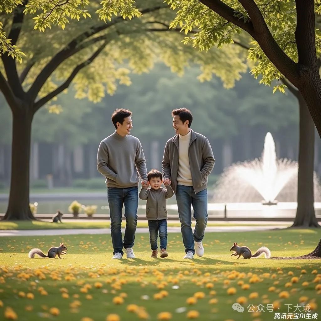 提示词:在户外的公园里,2个年轻的中国爸爸带着一个3岁的儿子逛公园,他们看起来非常幸福。