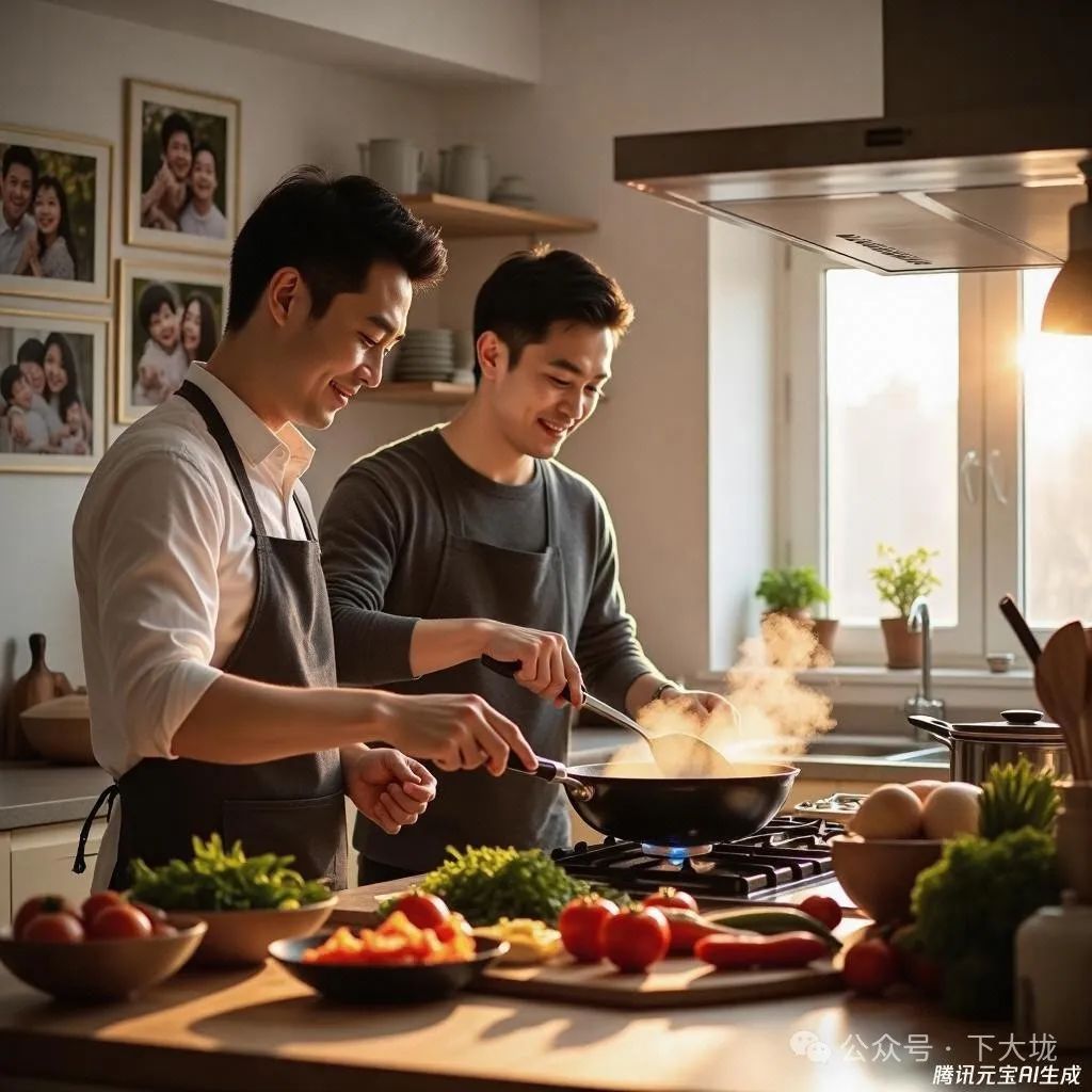 提示词:在厨房内,2个30岁的中国男人一起在做饭炒菜,准备他们的浪漫晚餐。
