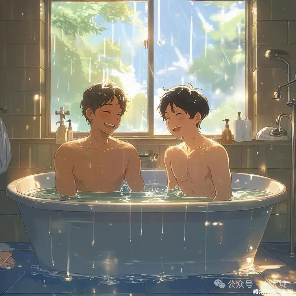 提示词:请画出如下漫画:2个男生坐在浴缸内一起洗澡。