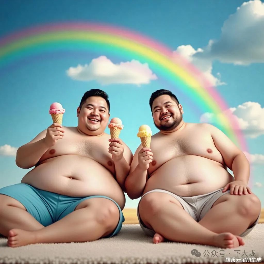 提示词:请画出如下漫画:2个胖胖的男人在一起吃冰淇淋,天空中出现了彩虹。