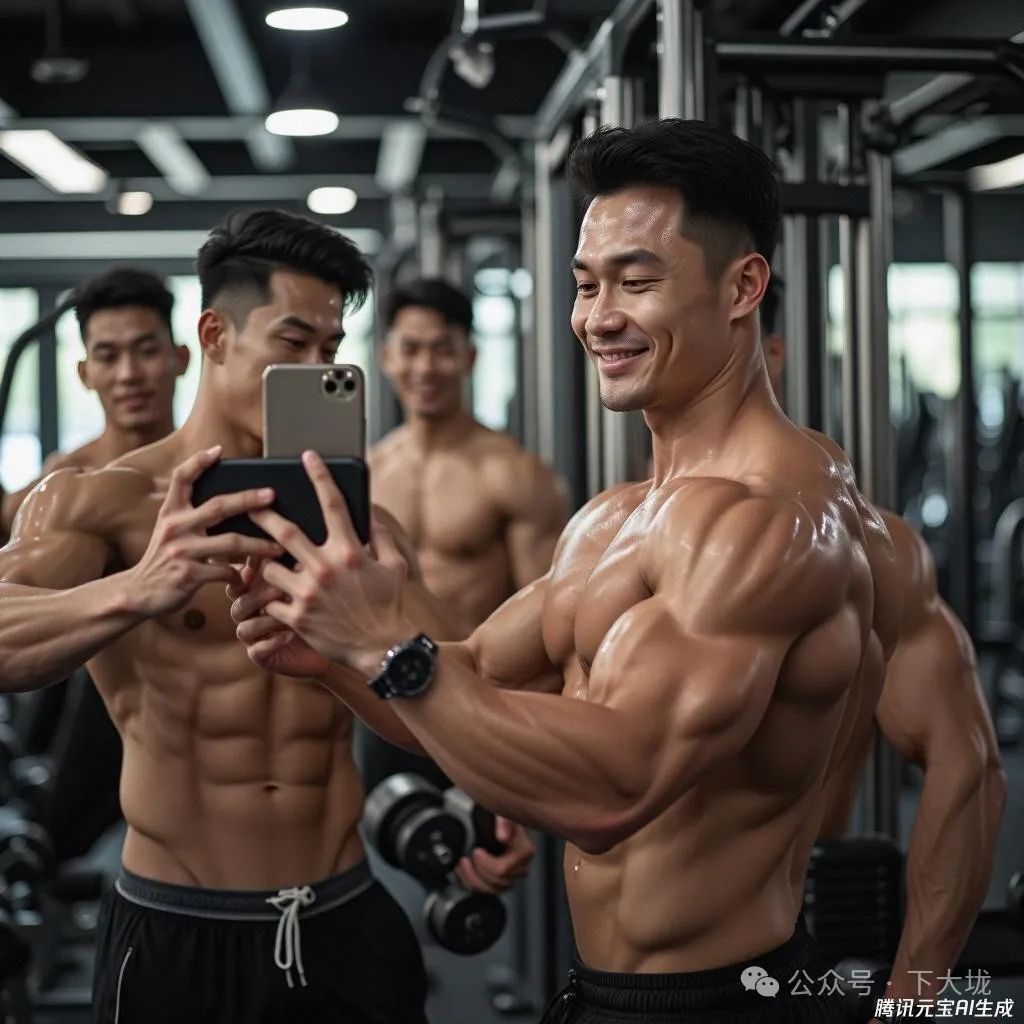 提示词:在一家健身房内,一群30岁左右的中国肌肉男正在健身撸铁,还有肌肉男在一旁自拍。