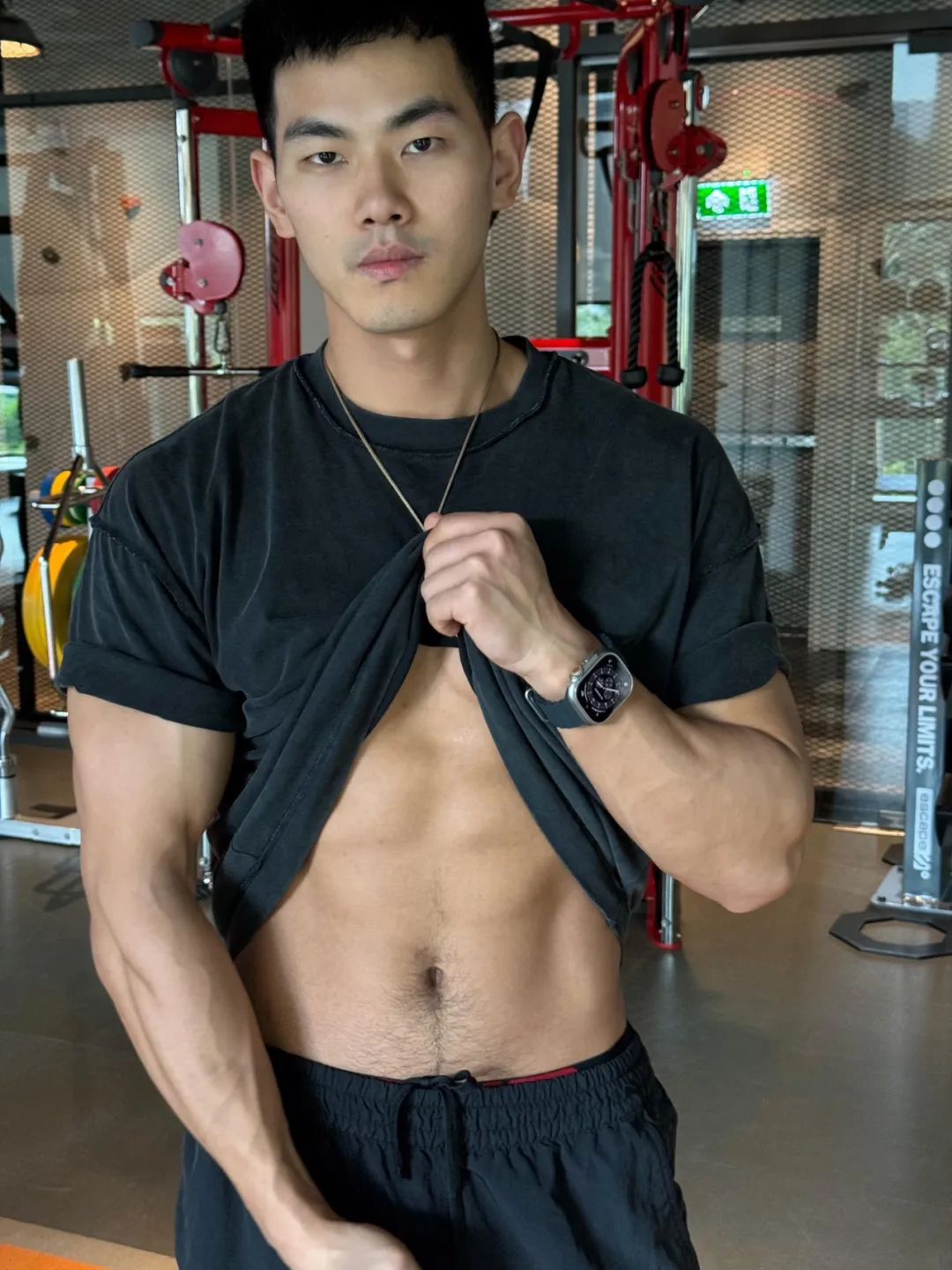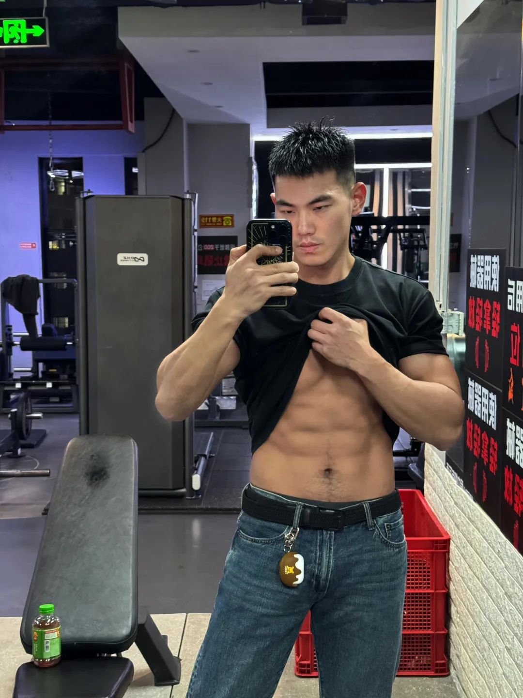 熊猫超人的腹肌锻炼的很漂亮,排列整齐,还有人鱼线,爱的把手,这个掀起衣服漏出腹肌的照片真是绝绝子,加上熊猫超人的长相很有男子气概,配上黑皮肤,太man了。