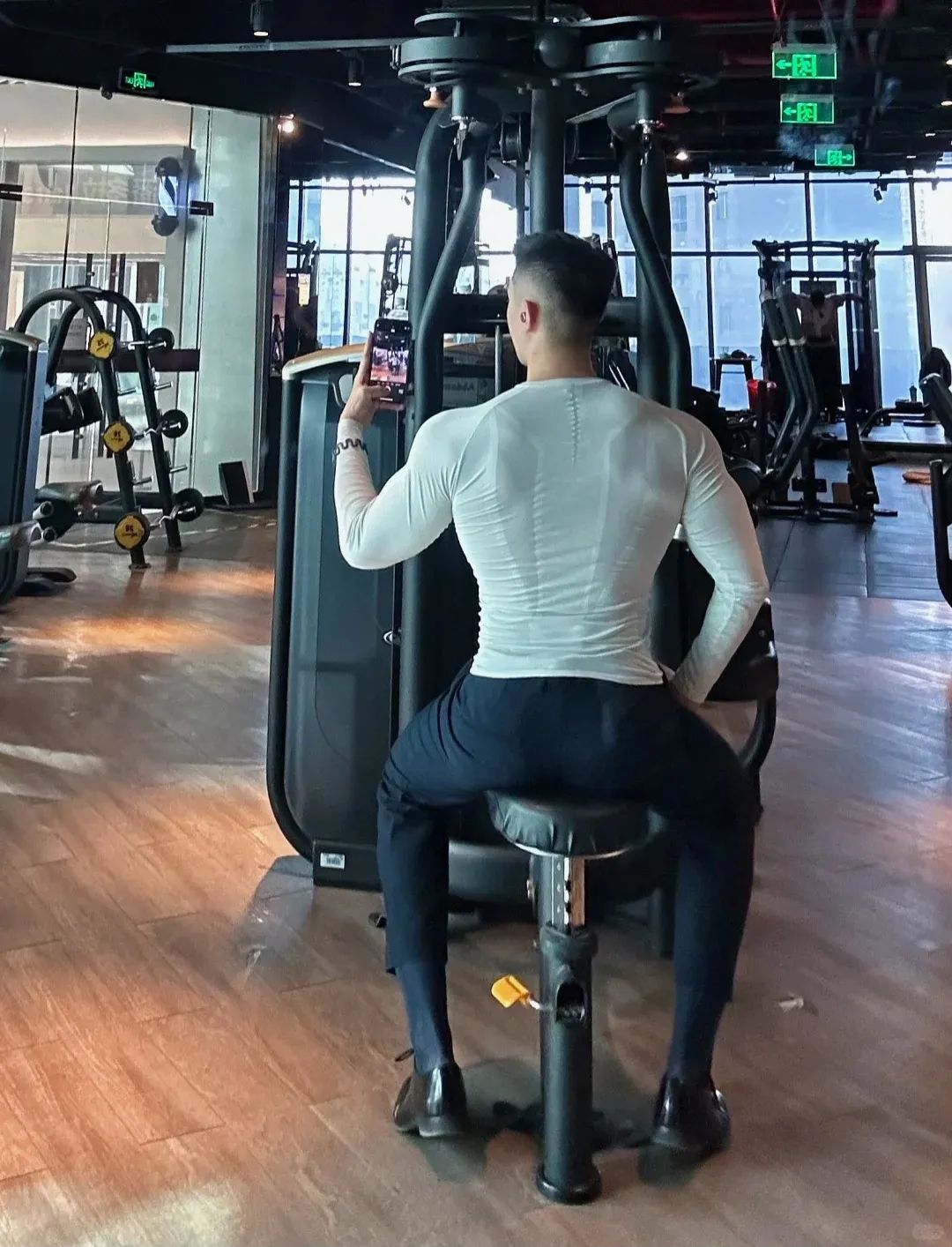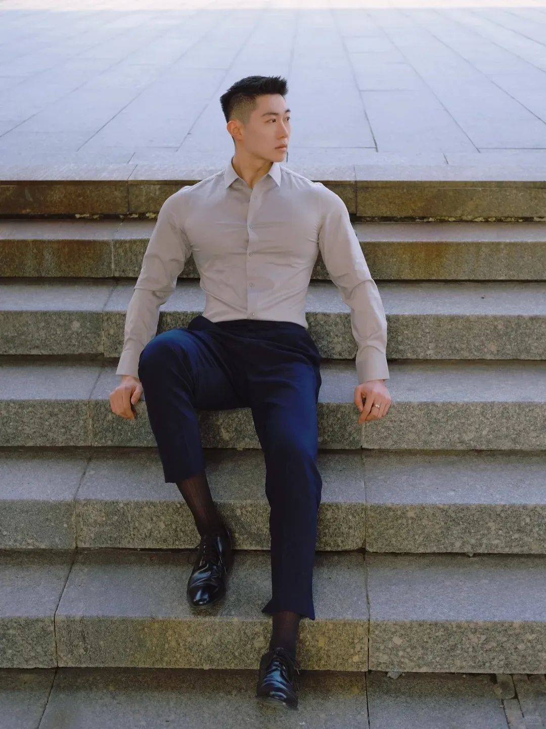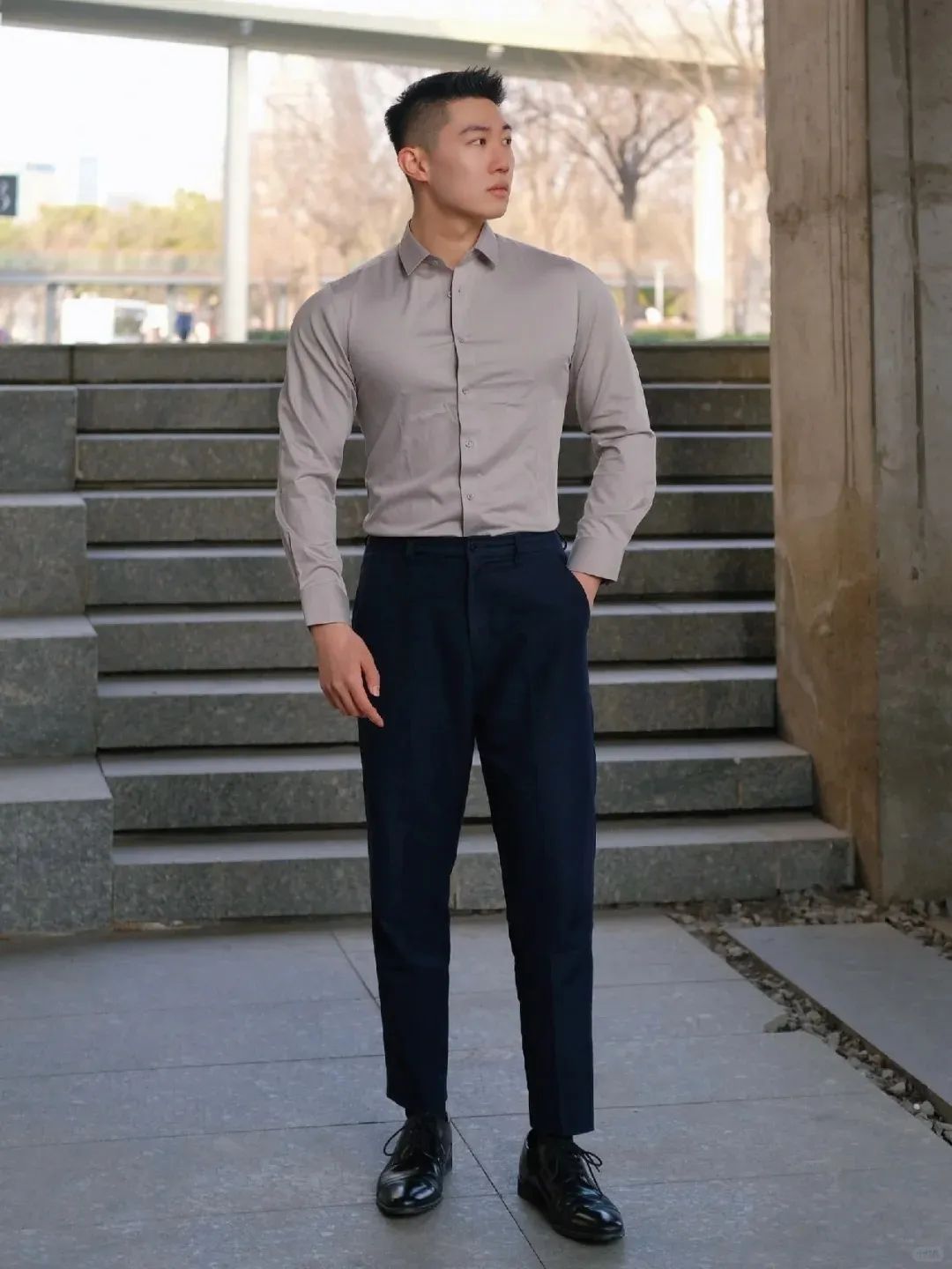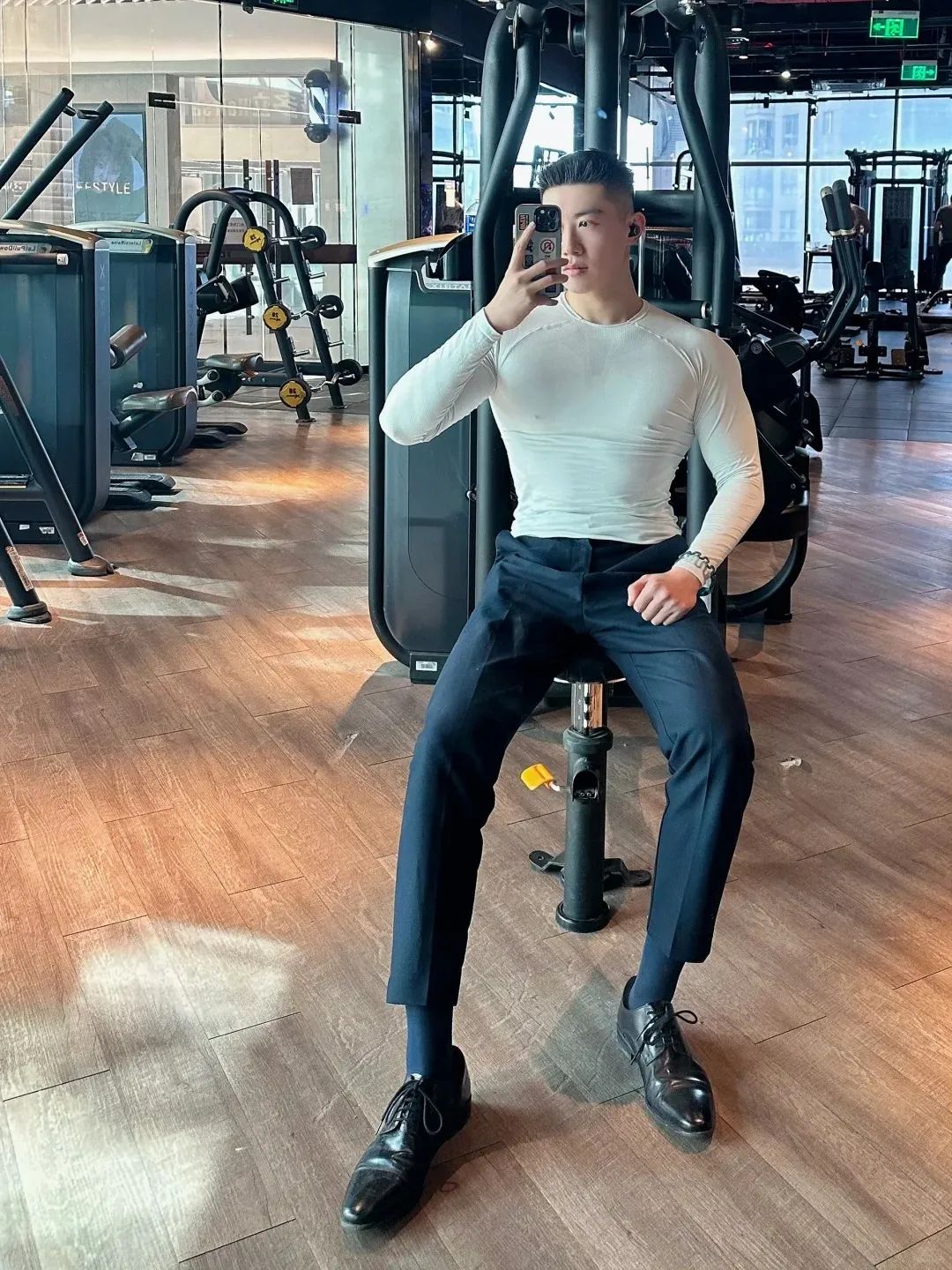 #正装皮鞋&不拘一格#,帆哥告诉你,即使是身处严谨的商务环境,身穿藏青色西裤搭配正装皮鞋,也依然可以保持个性与活力。瞧瞧他中午健身时的独特穿搭,上衣换掉,西裤皮鞋却依然在线,这就是现代都市年轻人快节奏生活的真实写照,看似滑稽却又无比真实,引人会心一笑!健身房,下午茶,无缝对接!