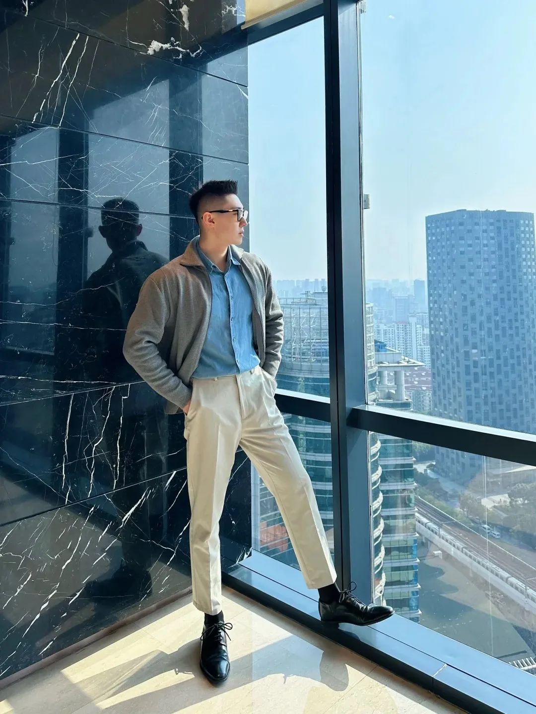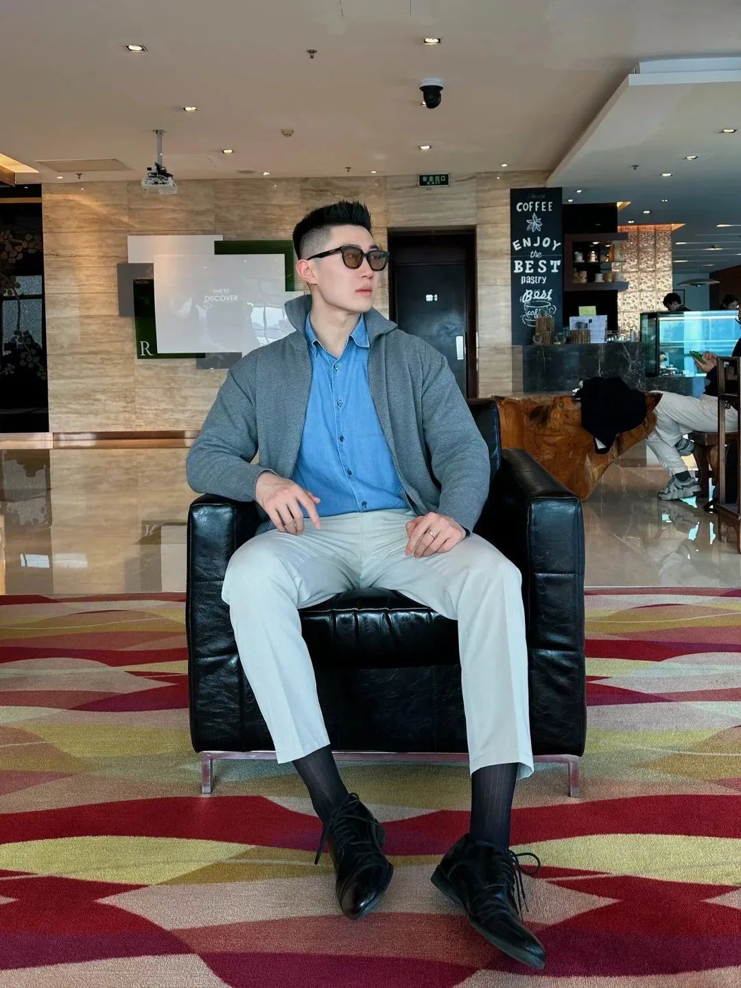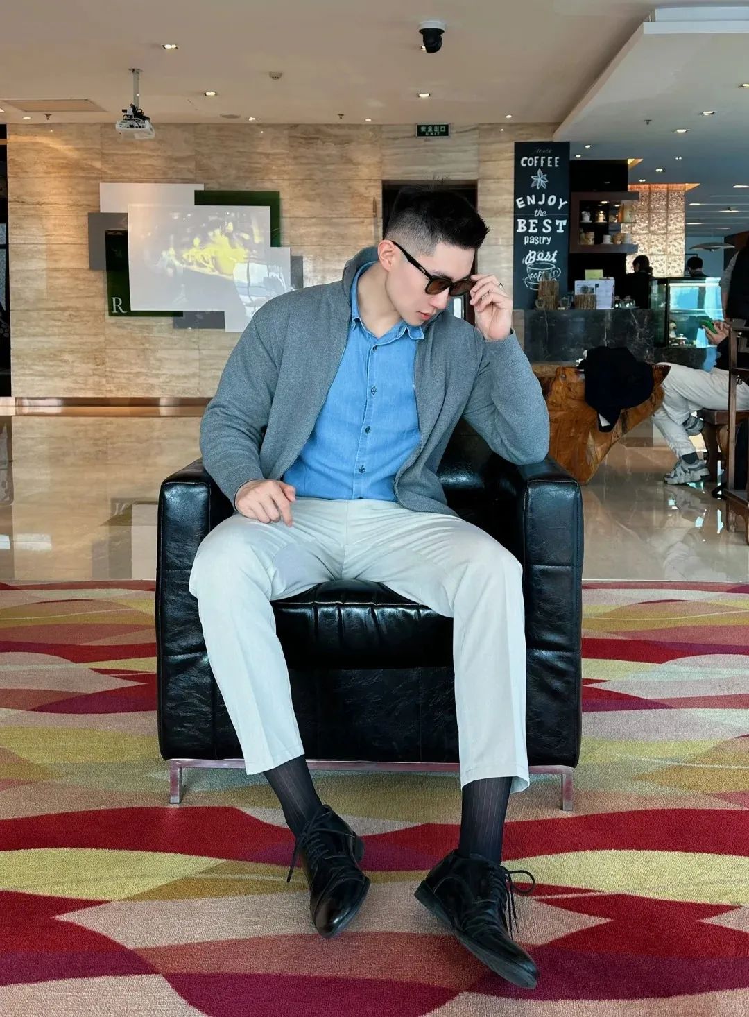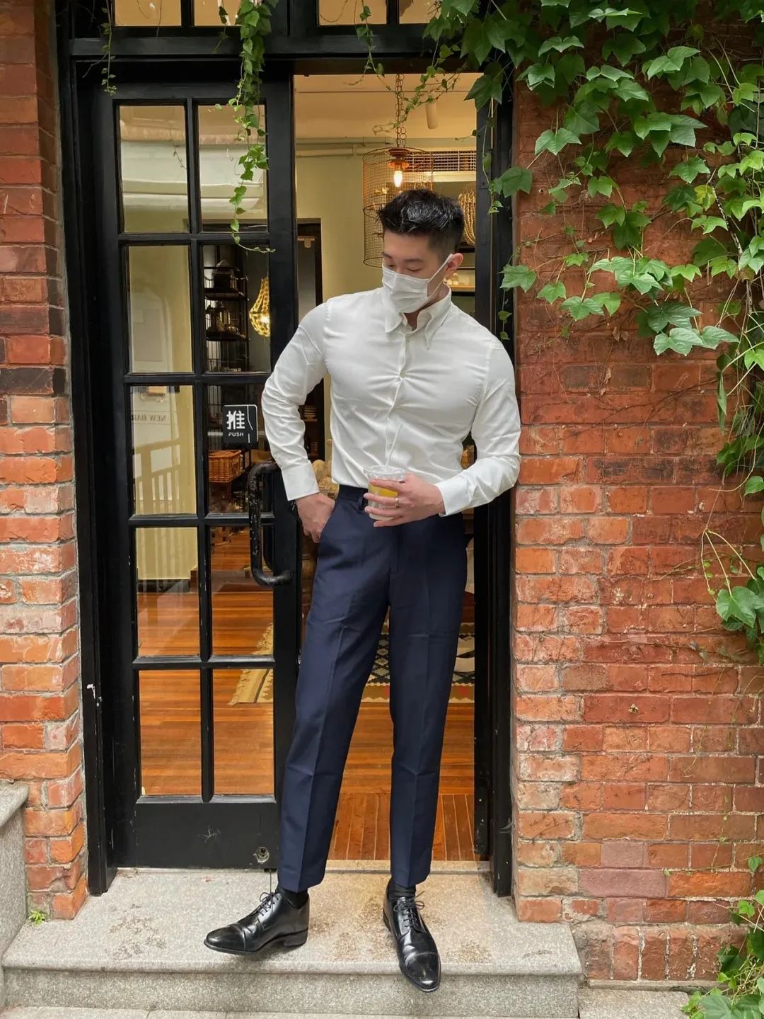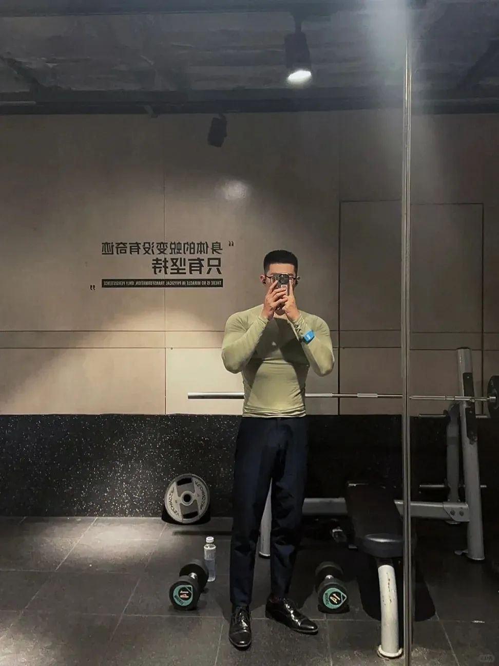 #正装皮鞋&不拘一格#,帆哥告诉你,即使是身处严谨的商务环境,身穿藏青色西裤搭配正装皮鞋,也依然可以保持个性与活力。瞧瞧他中午健身时的独特穿搭,上衣换掉,西裤皮鞋却依然在线,这就是现代都市年轻人快节奏生活的真实写照,看似滑稽却又无比真实,引人会心一笑!健身房,下午茶,无缝对接!