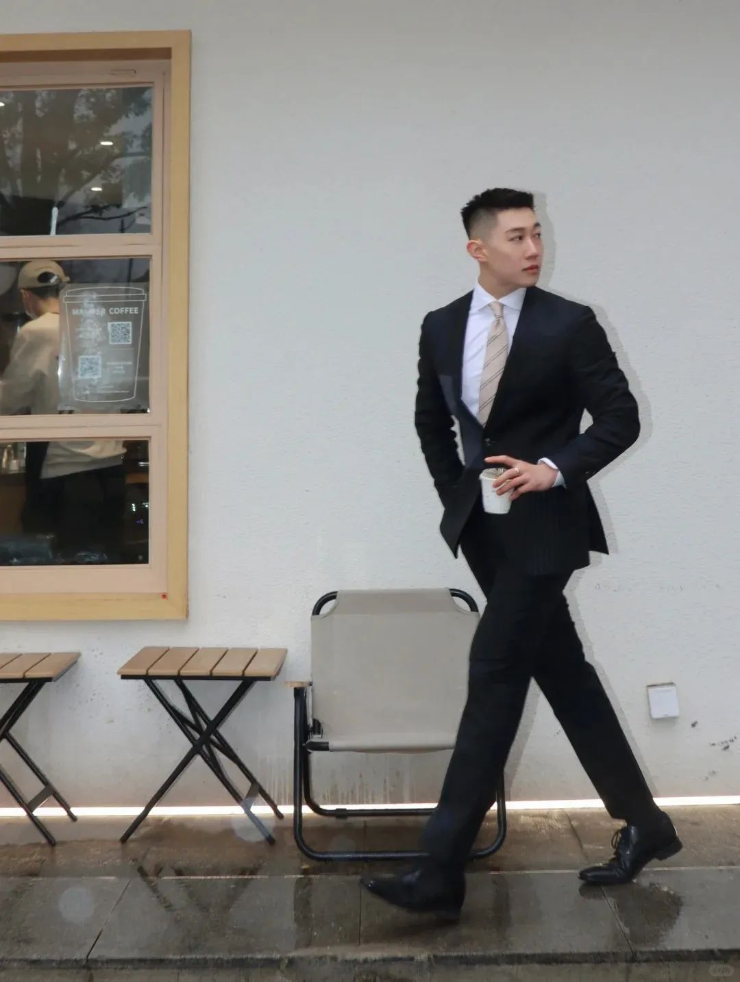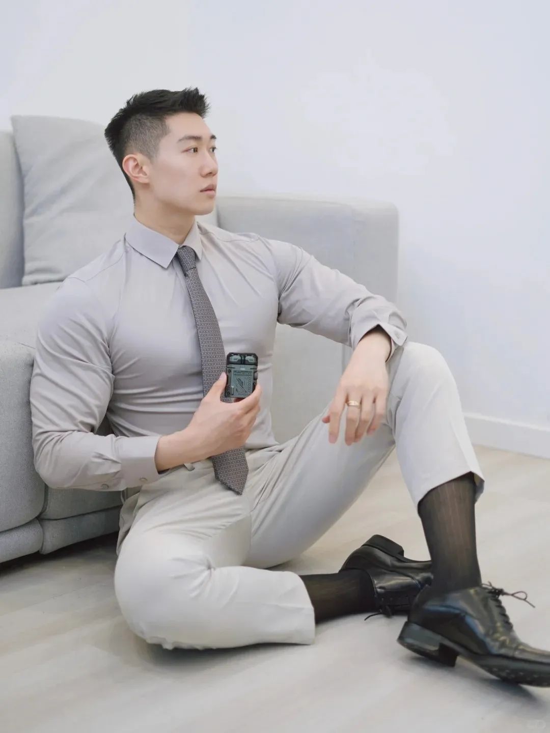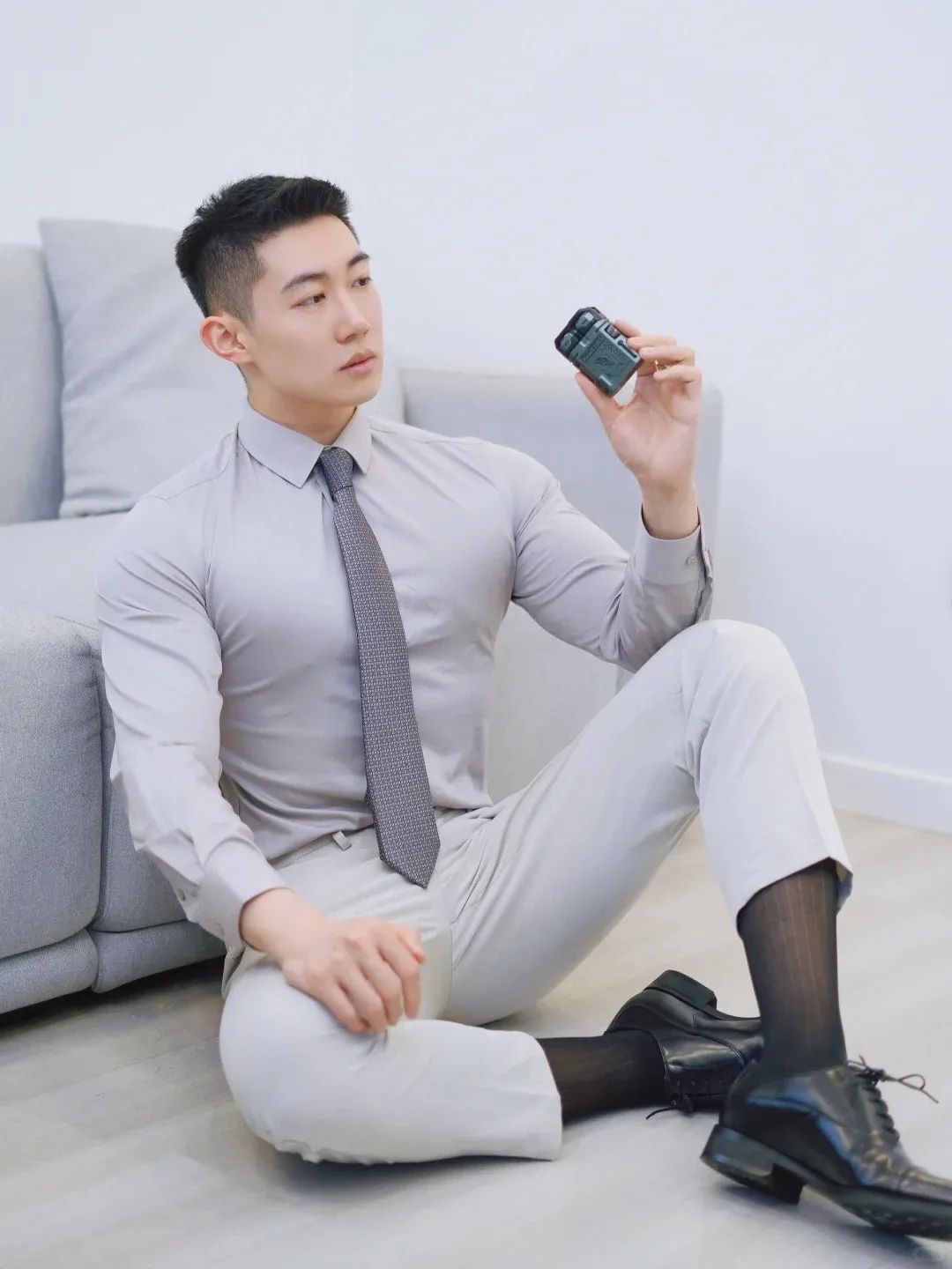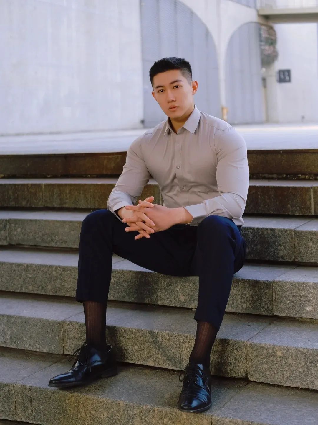 #正装皮鞋&不拘一格#,帆哥告诉你,即使是身处严谨的商务环境,身穿藏青色西裤搭配正装皮鞋,也依然可以保持个性与活力。瞧瞧他中午健身时的独特穿搭,上衣换掉,西裤皮鞋却依然在线,这就是现代都市年轻人快节奏生活的真实写照,看似滑稽却又无比真实,引人会心一笑!健身房,下午茶,无缝对接!