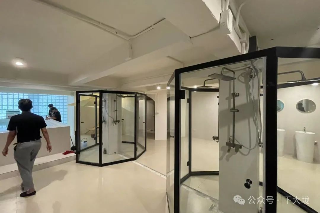在玻璃淋浴房的一侧,还有3个洗漱池,附近还有几个卫生间。从装修环境来看,里面灯光比较明亮,而且比较白净,毕竟是全新的场所。另外一张不可公开的照片则显示,里面还设施了一些巧妙的设施,确实比较吸引人,而且比较有意思。