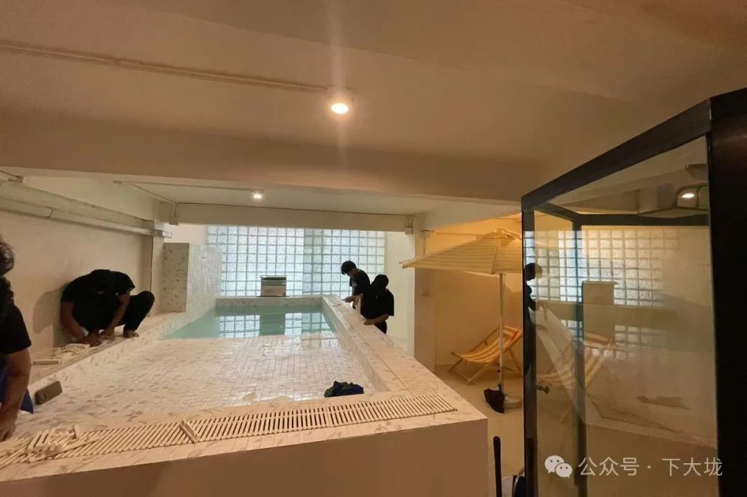 根据曝光的照片显示,当时里面正在施工,疑似在做最后的装修工作。里面有几个玻璃淋浴房,旁边还有一个泡池可以泡澡,工作人员正在瓷砖上面做装饰工作。