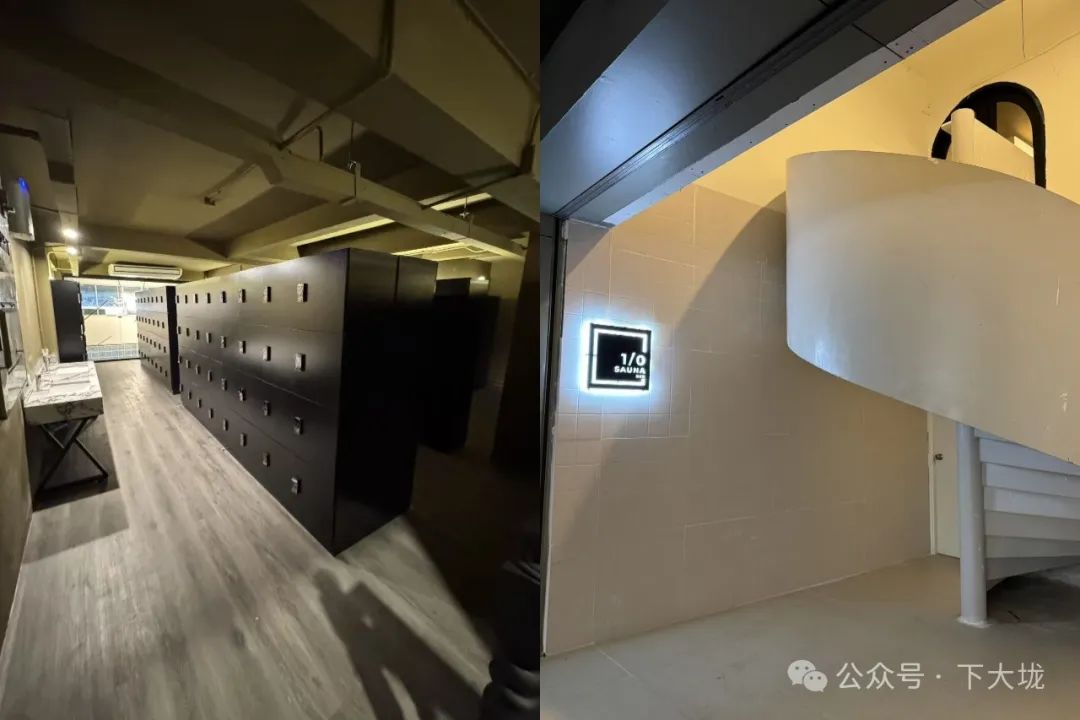 更衣室的照片显示,里面的储存柜是黑色的,柜子空间还比较大,可以放下一个书包。此外,更衣室的空间也比较大,应该不会人挤人。此外,里面还有一个旋转楼梯,看得出来空间至少有2层。