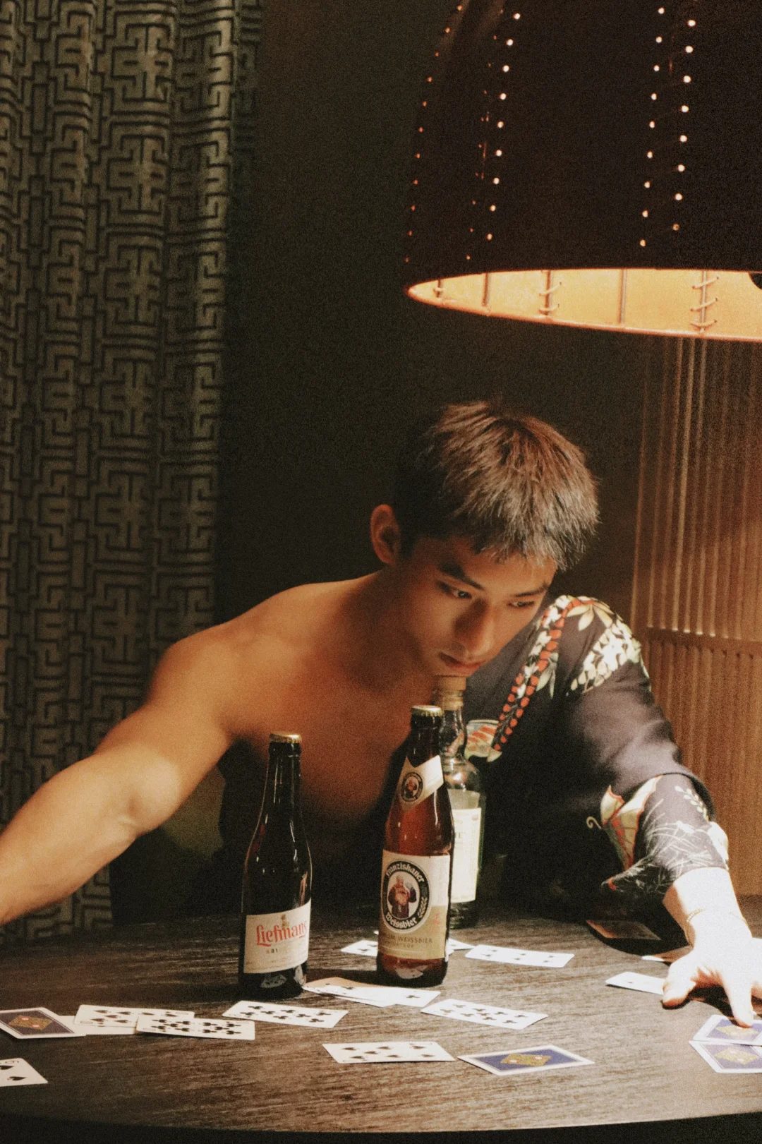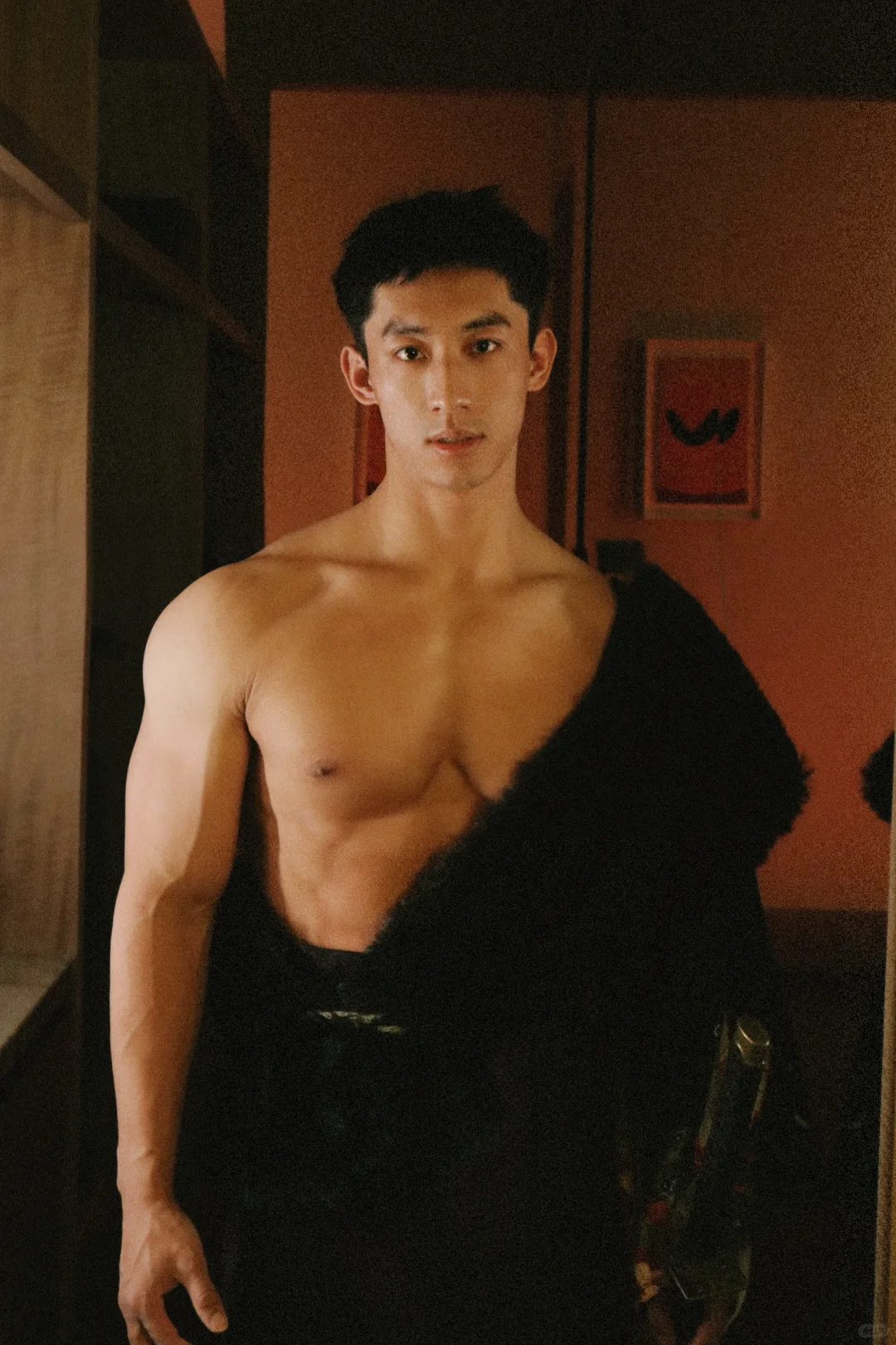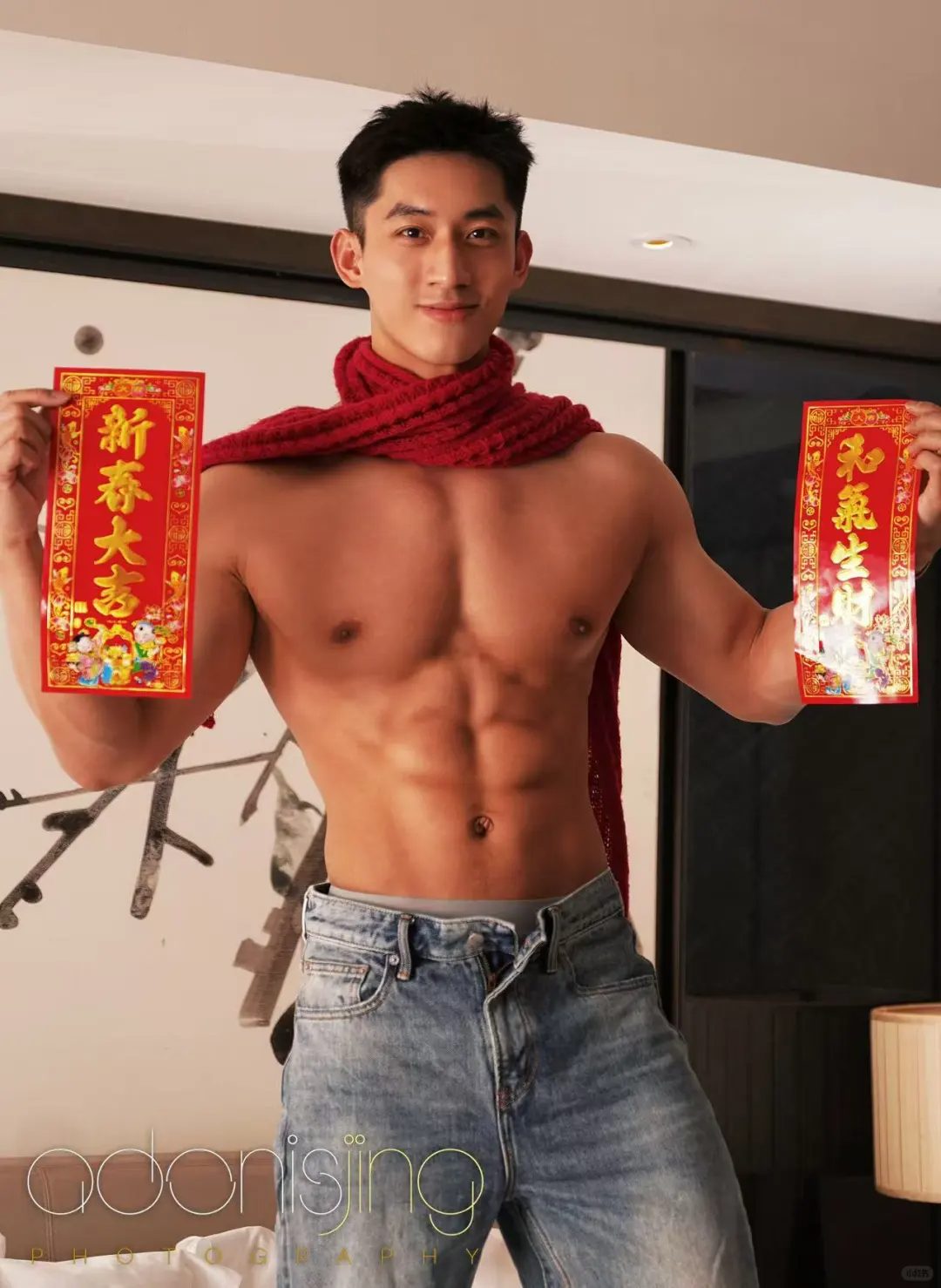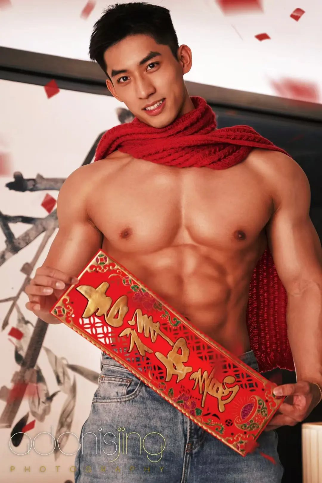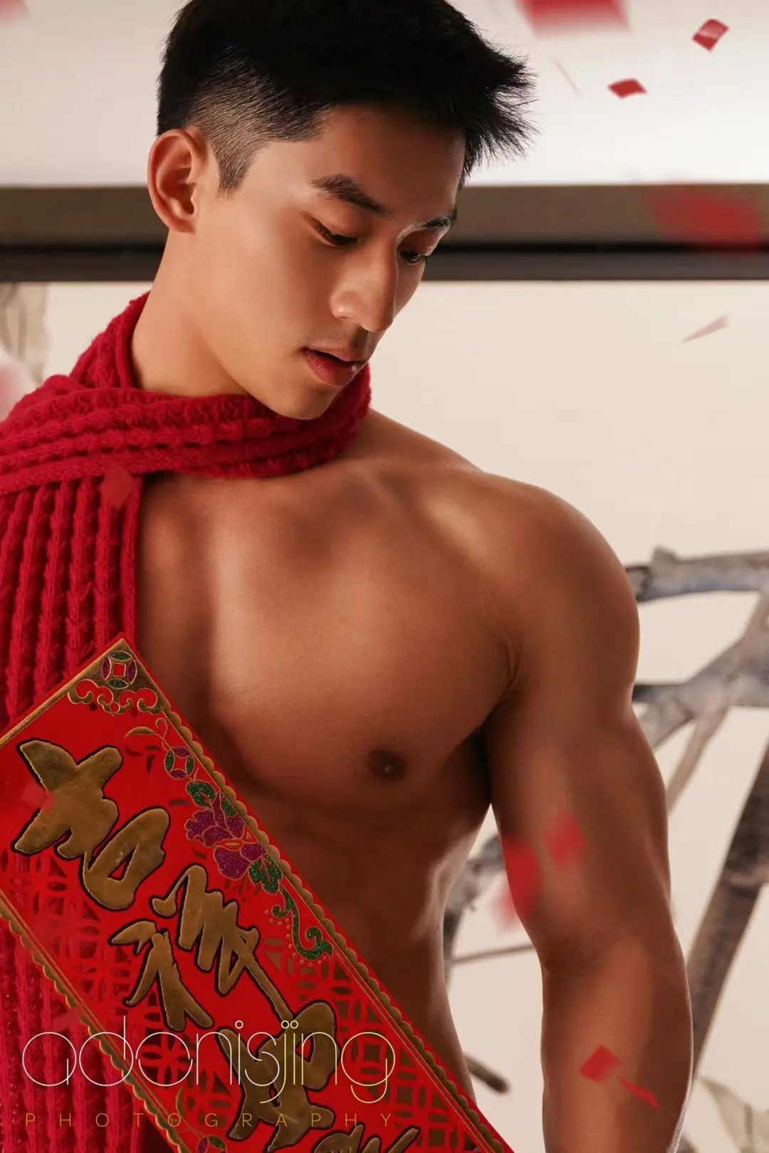 刘京老师的镜头绝对是开过光!平时在健身房挥汗如雨的糙汉,一到他手里,直接变身人间凶器——红色唐装扣子硬是被胸肌崩开两颗,手臂青筋盘错得像龙纹刺青,端着年糕的手指节分明得能去当手模!最绝的是侧脸杀,下颌线锋利得能裁红纸,抬眼瞬间的野性眼神…这真的能免费看?