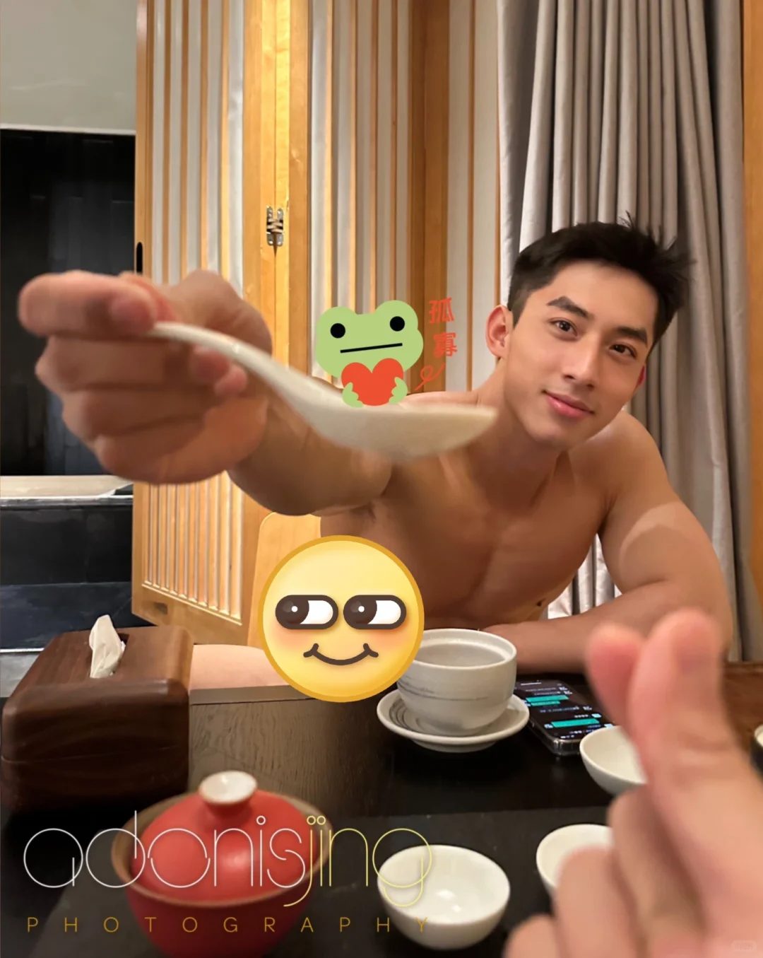 说回刘京的神图!当时拍写春联镜头,这哥 握着毛笔的手臂肌肉偾张,但笔尖却稳稳写出簪花小楷。汗珠顺着锁骨滑进深V领口时,现场打光师手抖得能把灯光师证撕了!后来流出的花絮视频里,他裹着羽绒服蹲在路边吃烤红薯,画风瞬间从 危险猛男 变成 大型犬科动物 ——这反差感,谁不沦陷?