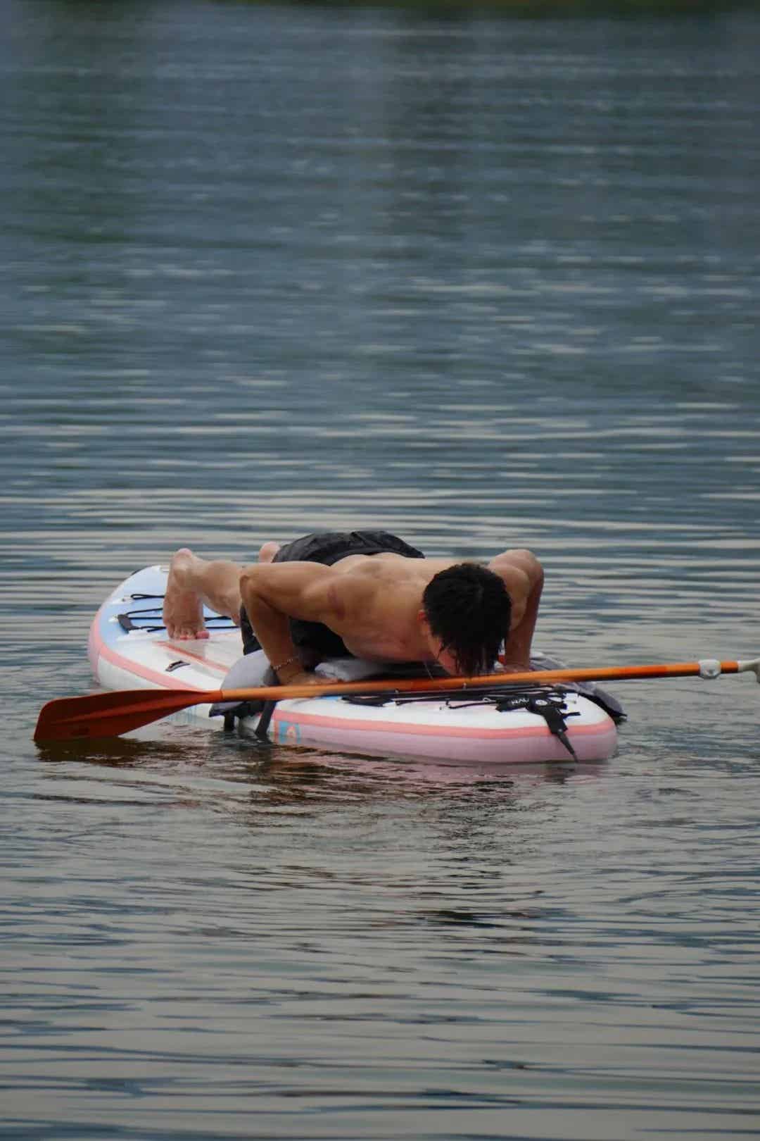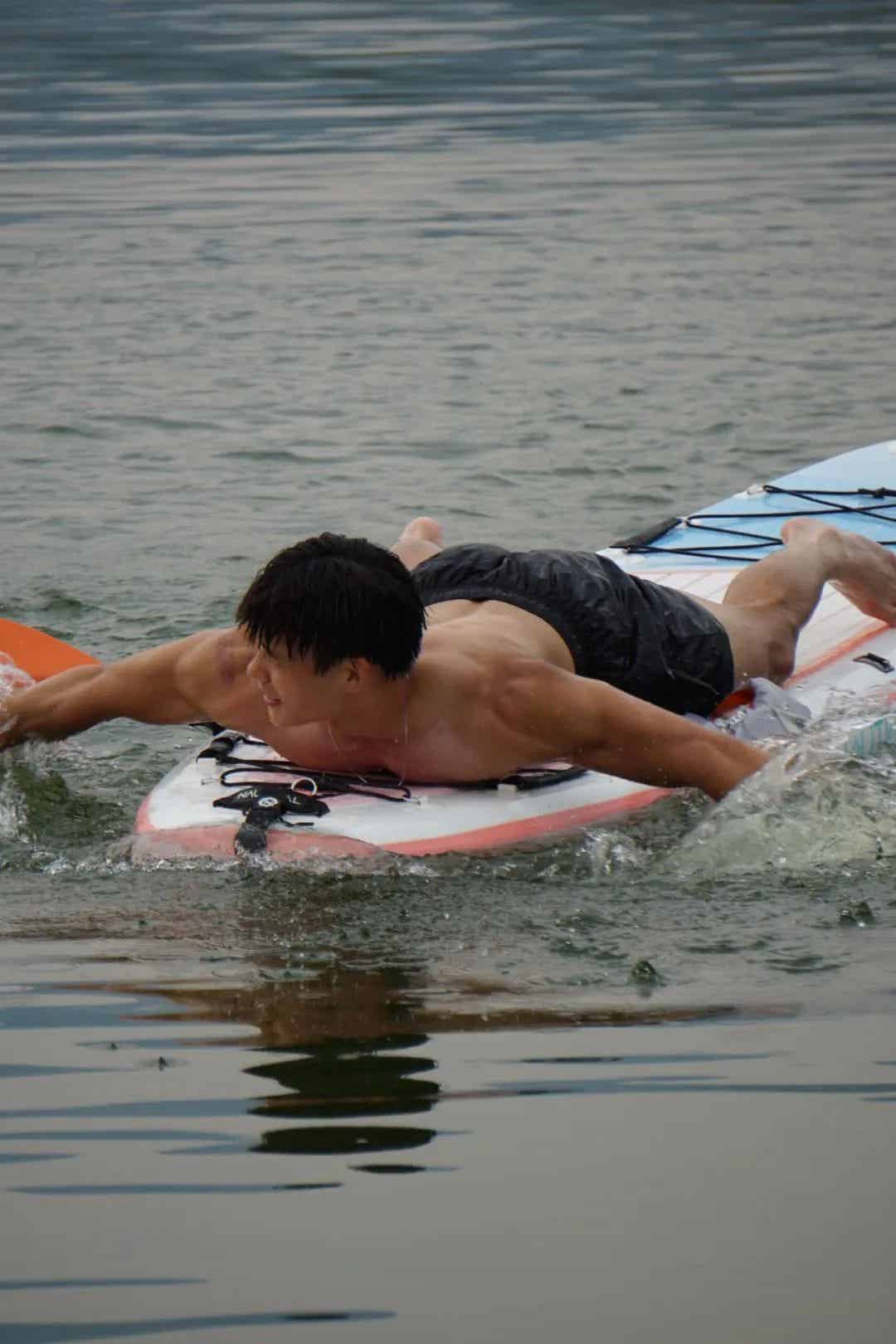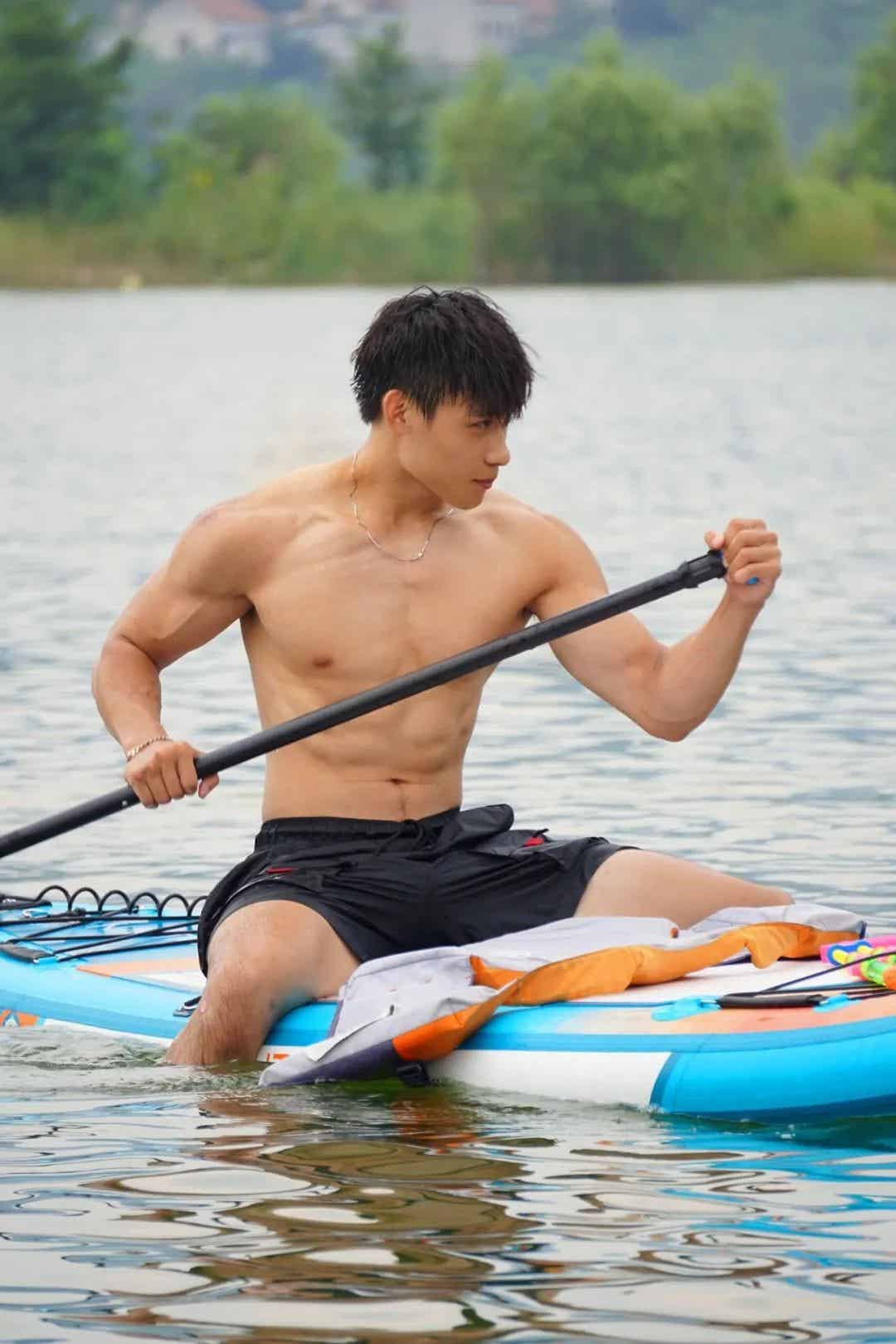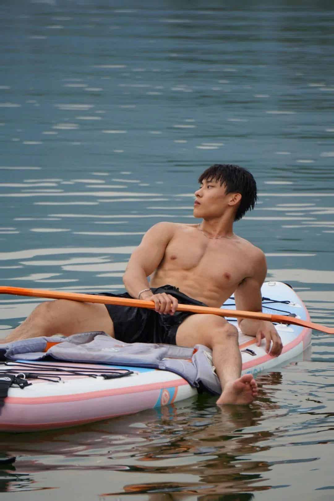 在拍摄过程中,摄影师捕捉到了他那种随性而又自然的状态。无论是专注划桨时微皱的眉头,还是在水中放松时自然舒展的笑容,都让人不禁为之倾倒。正是这种既充满力量又不失柔情的魅力,让他的每一张照片都成为了视觉与情感的双重享受。