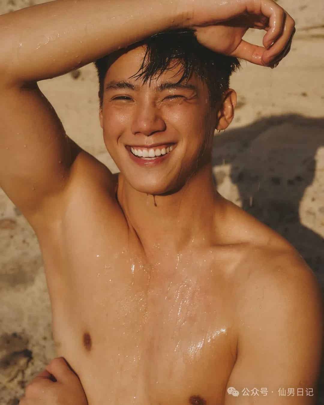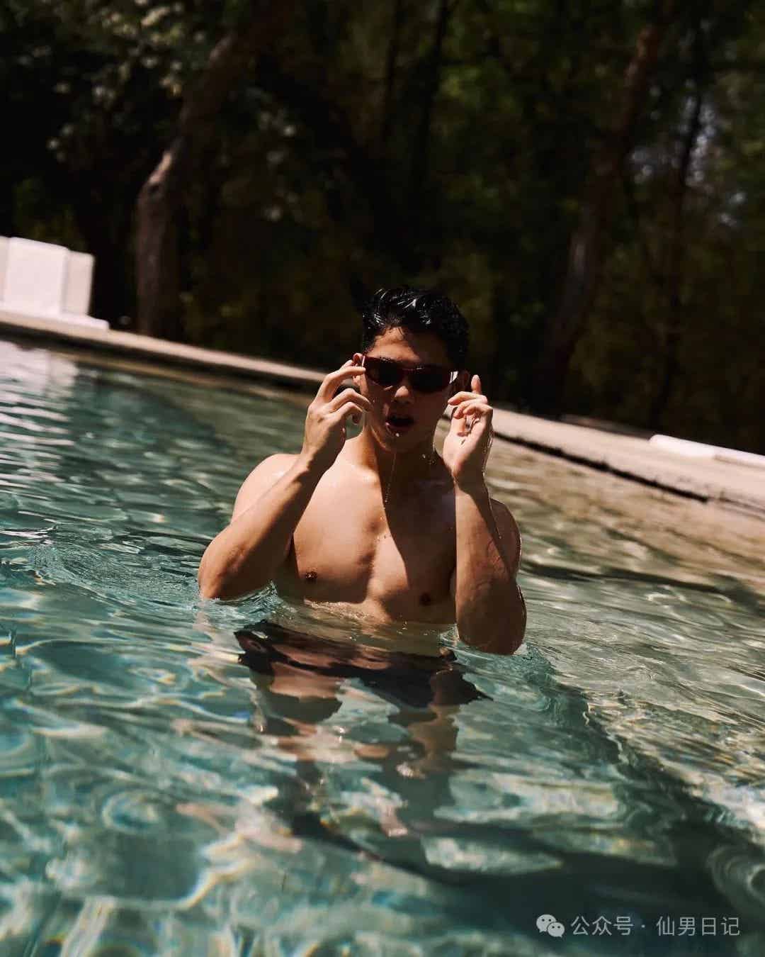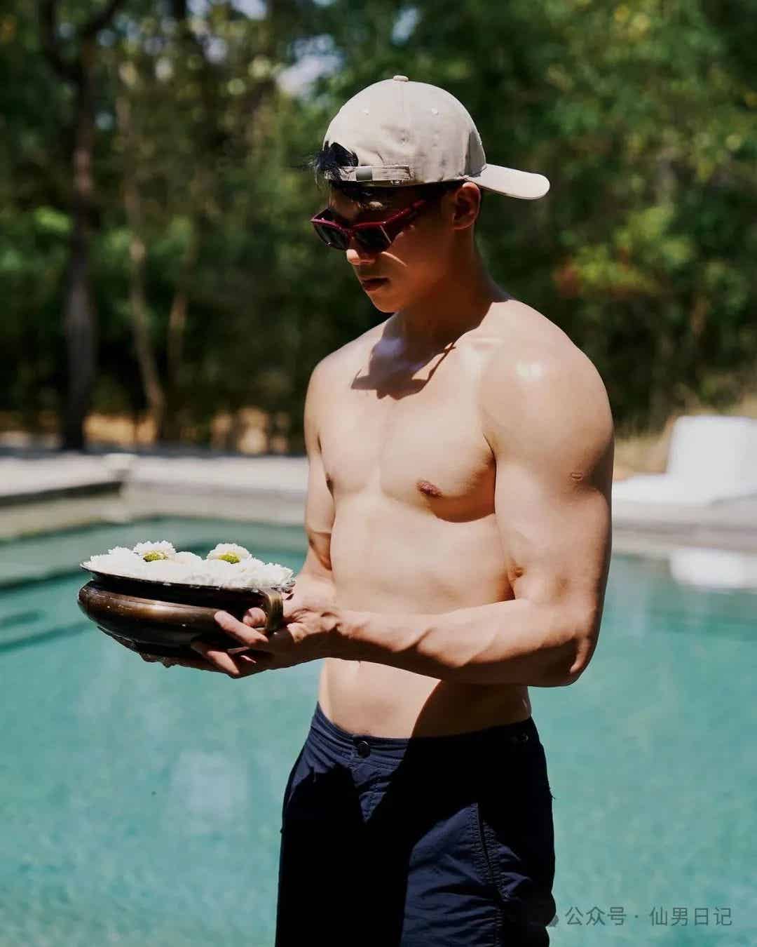 更绝的是他玩水的瞬间被抓拍:水花拍打胸膛的瞬间,水珠在胸肌沟壑间折射出彩虹,这个视觉真的太棒了!