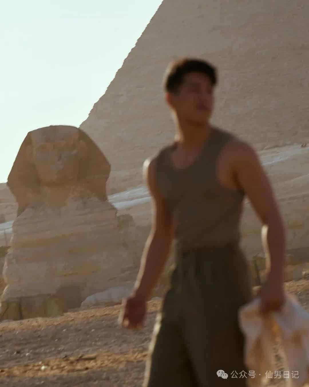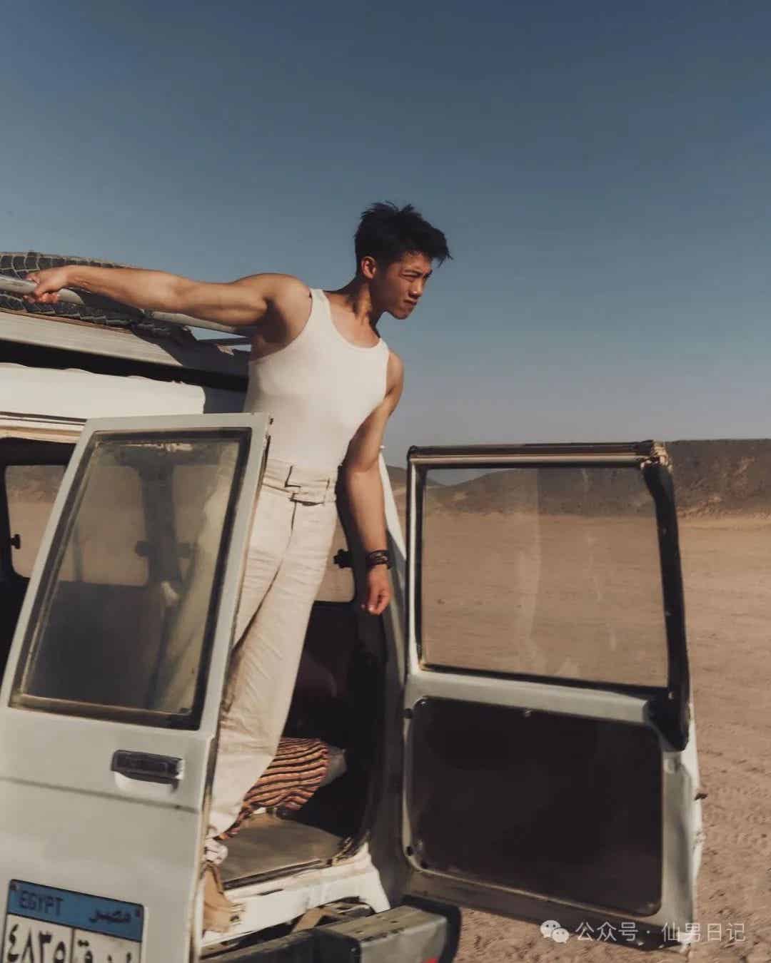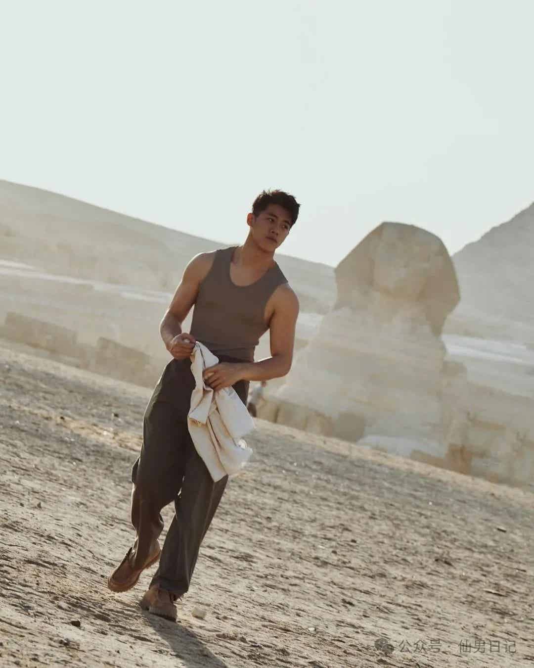 单手俯撑在沙丘顶,背肌随日落光影变幻成金色山脉,有种纸醉金迷的既视感。