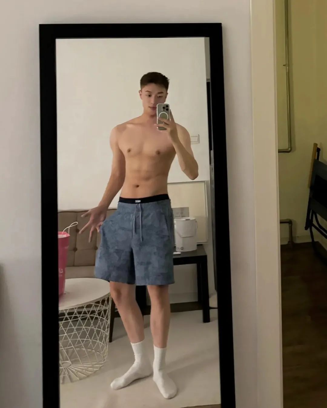 说到年糕小林,第一印象就是“高挑”!185的身高往那一站,气场直接拉满。别看他是个健身博主,平时穿搭却有点雅痞风,白袜配高弹裤,休闲又带点痞帅的味道。关键是这身材,胸肌健硕,腰部紧实,手臂粗壮,后背宽厚,真的恰似那俊朗的少年,走到哪都是人群焦点。編私心觉得,这种身材穿啥都好看,随手一拍就是男友视角的既视感,躺在他身边估计能幸福到冒泡吧!