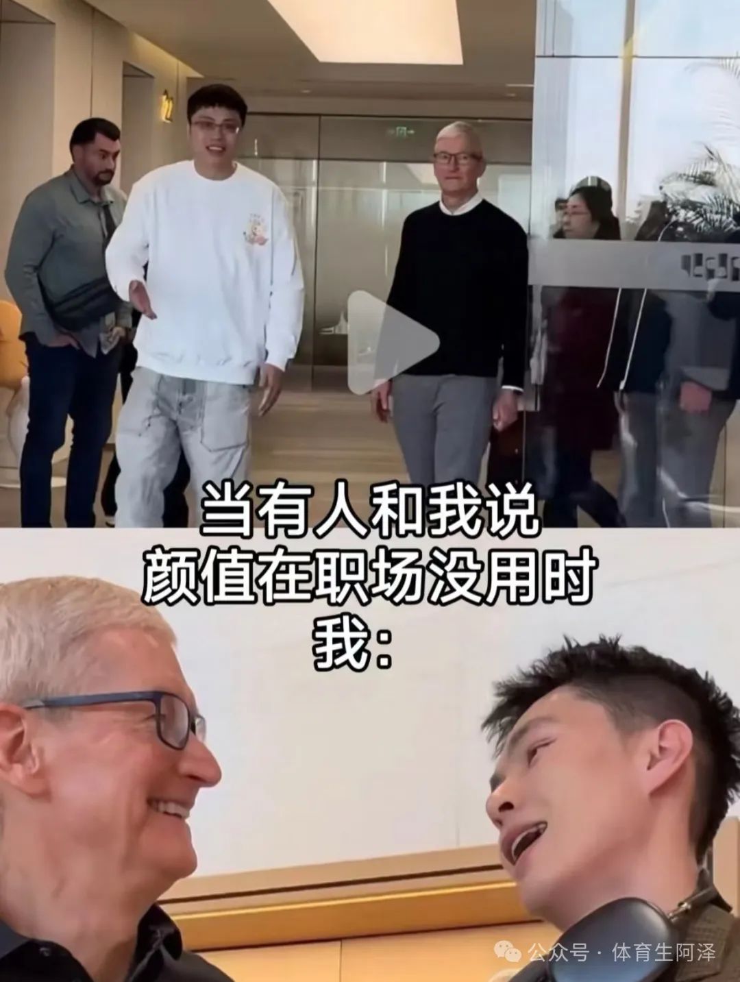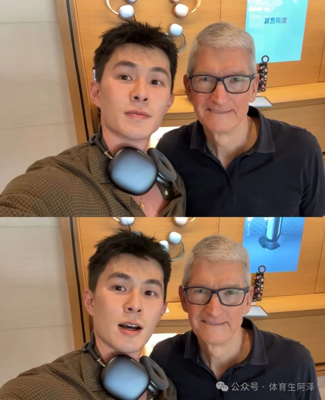 这两张照片已经足以说明这位狗狗男生的段位了,上面那种抿嘴的表情完全是展示他的痞帅风格,然后下面那张照片笑容满满,嘴唇微张,露出上齿完全是装可爱类型啊!然后反观库克,两张表情一摸一样毫无差别,而且眼神看起来完全是看李马特啊!