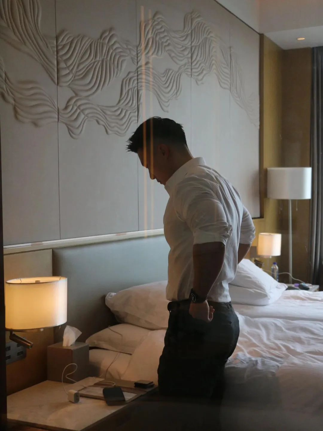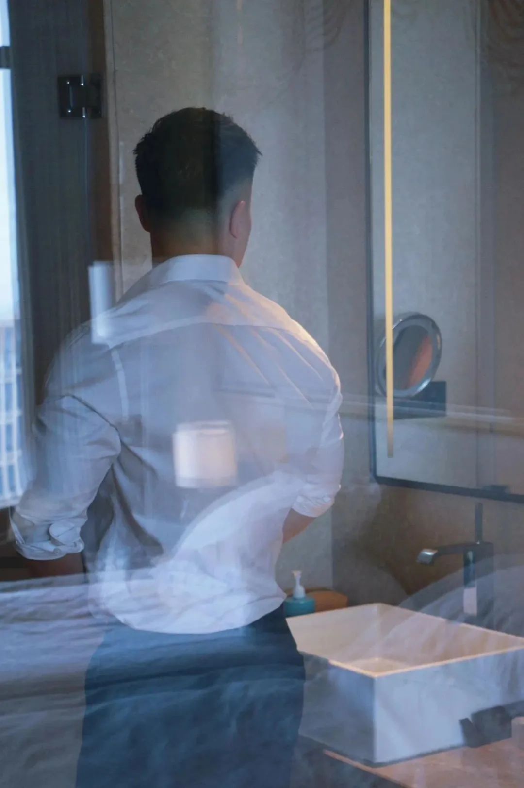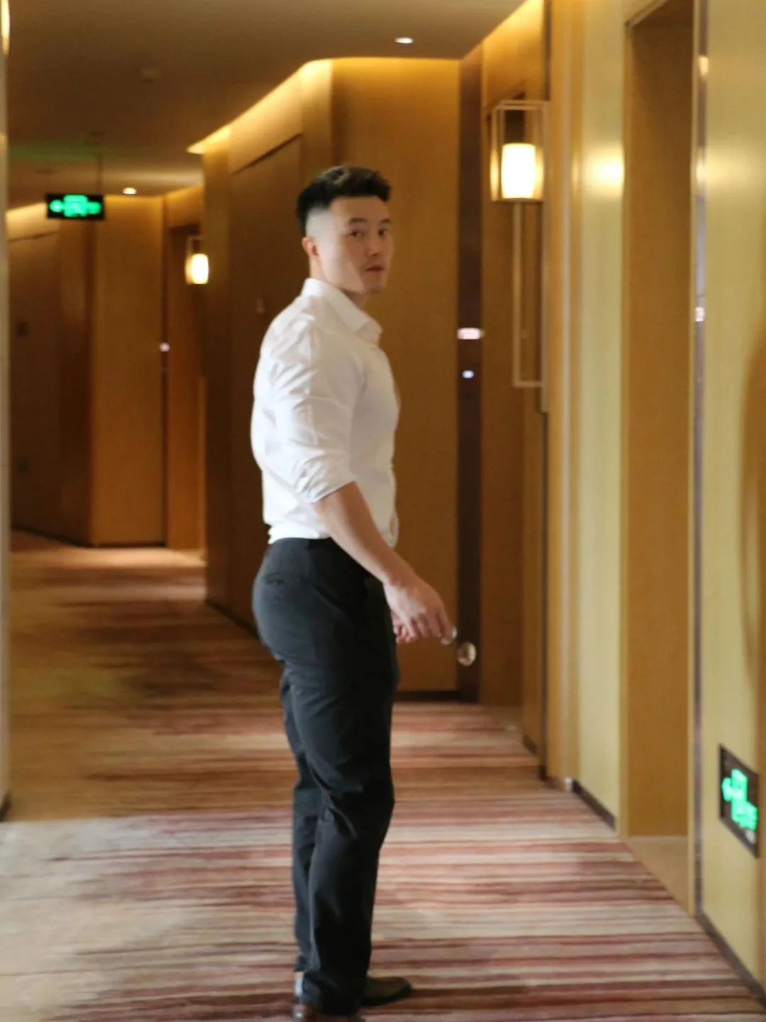 他的标志性造型——白衬衫搭配黑色西裤,简洁而经典,却在他身上展现出别样的韵味。挺拔的身姿,配合一个不经意的咬手指动作,便能激发观者无限的想象空间。尤其是在酒店走廊那深邃的背景下,他侧身回眸的瞬间,翘臀曲线若隐若现,散发出浓郁的人夫气息。