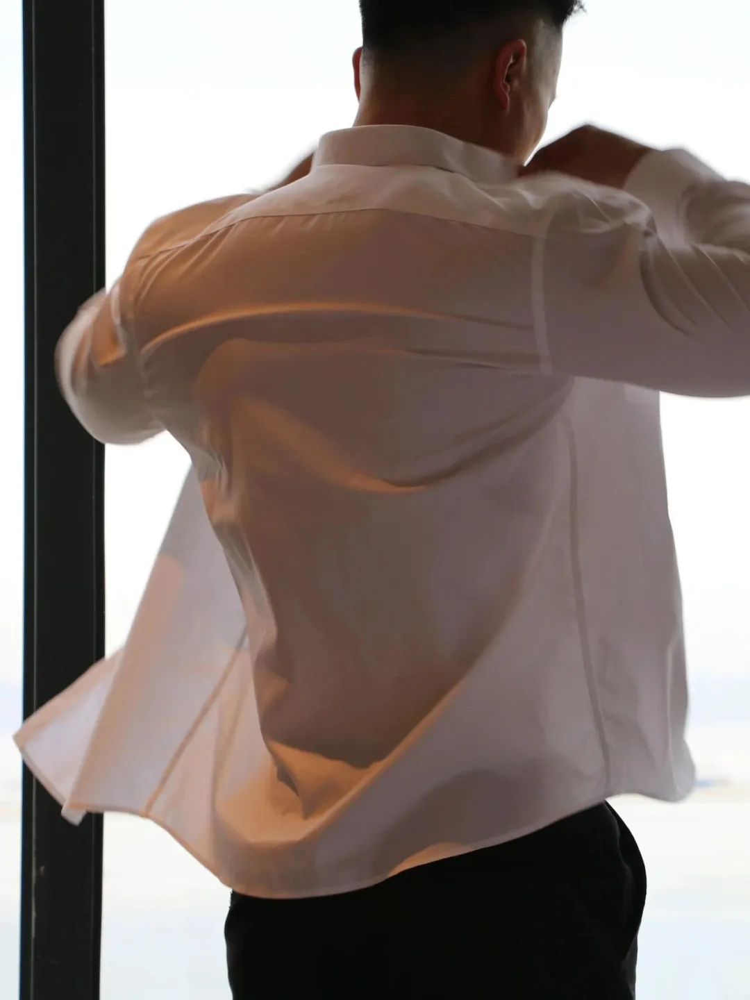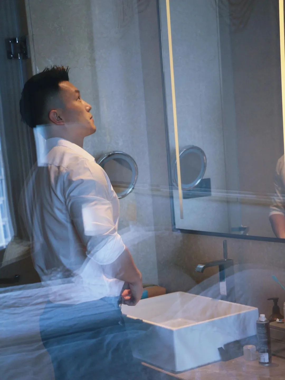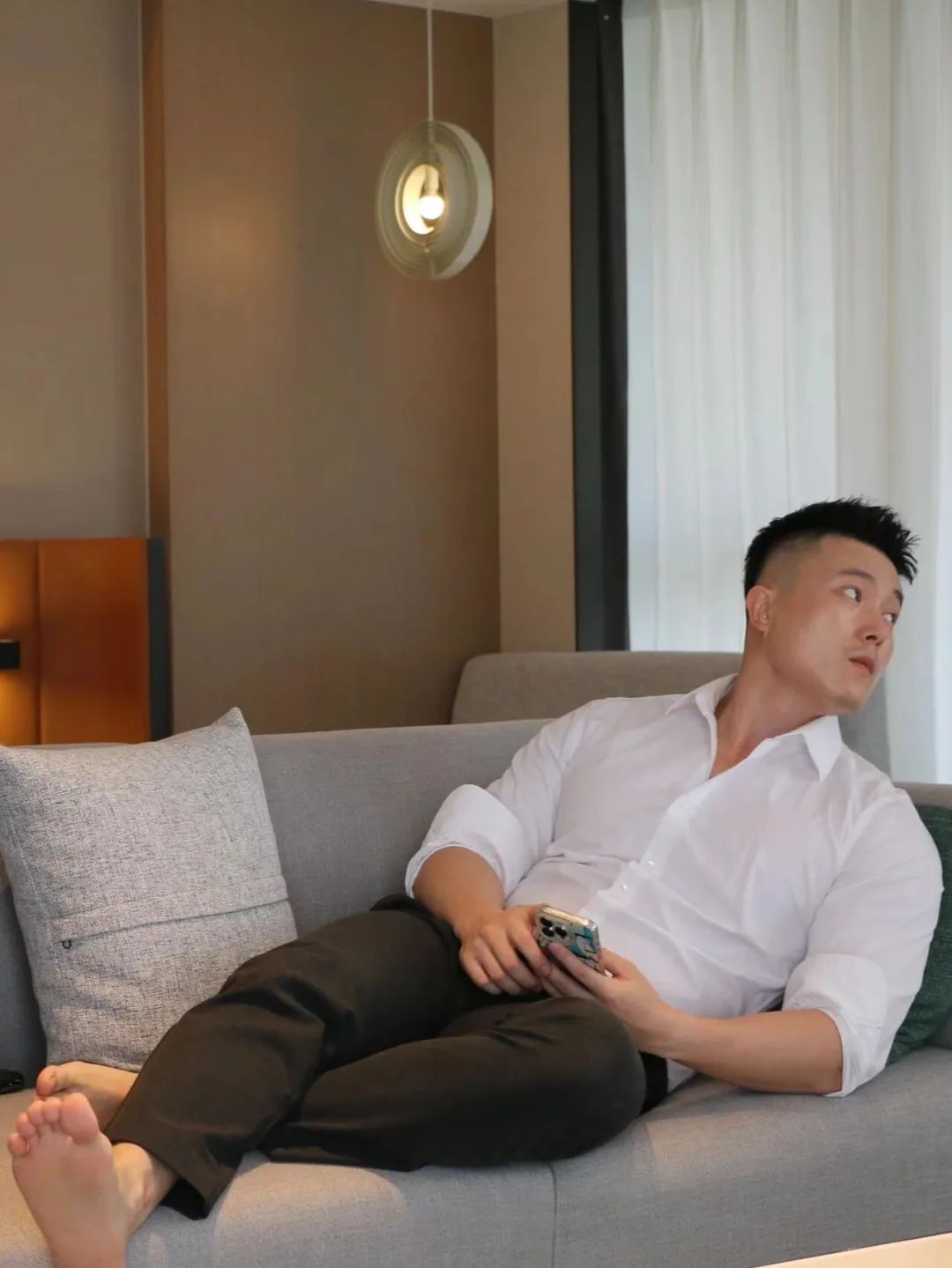 他的标志性造型——白衬衫搭配黑色西裤,简洁而经典,却在他身上展现出别样的韵味。挺拔的身姿,配合一个不经意的咬手指动作,便能激发观者无限的想象空间。尤其是在酒店走廊那深邃的背景下,他侧身回眸的瞬间,翘臀曲线若隐若现,散发出浓郁的人夫气息。