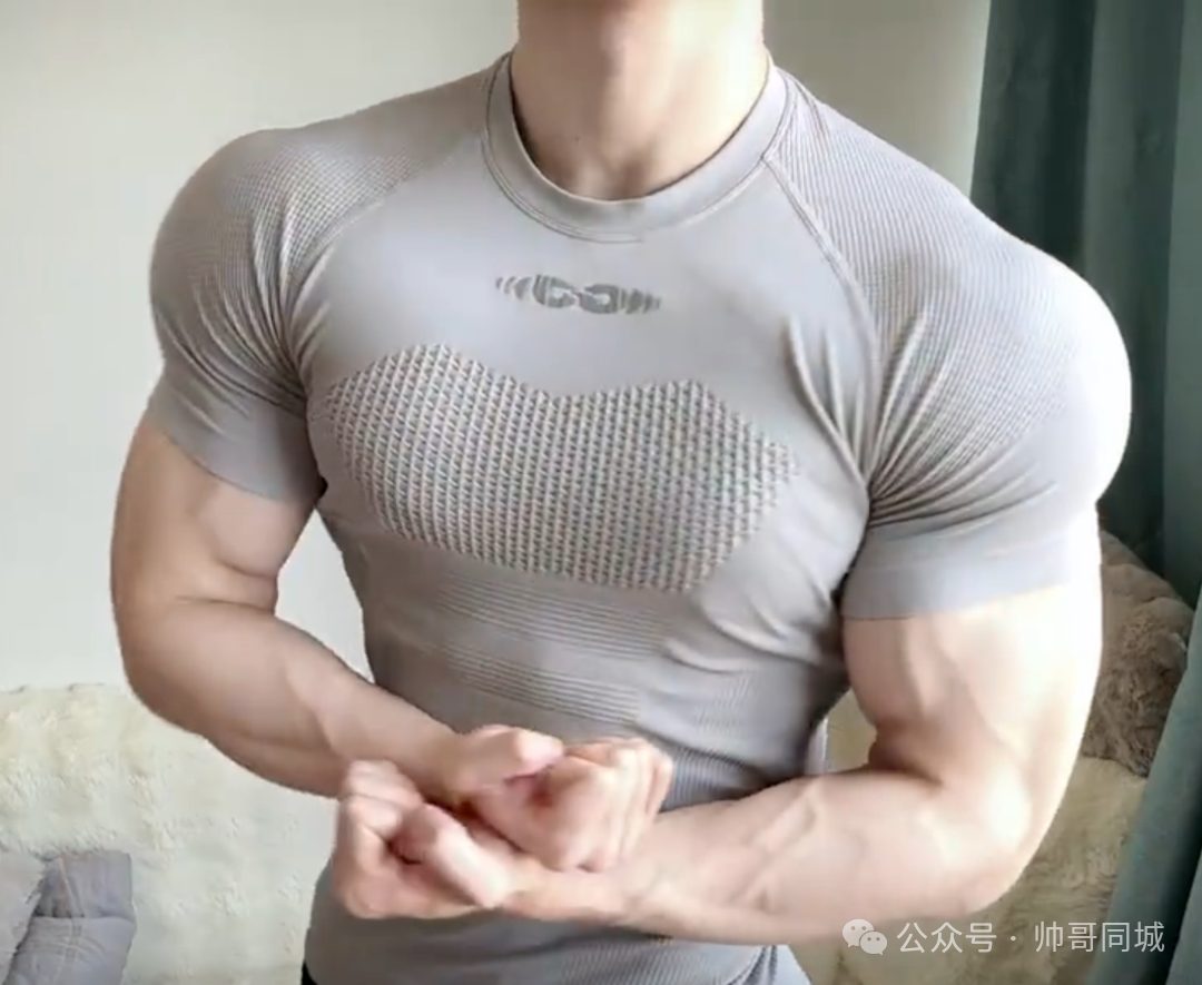 他的手臂力量感十足,肱二头肌和肱三头肌的纹理清晰可见,又粗又强壮,就像精心雕刻过一样。穿上紧身灰色运动服,肌肉充血后,衣服都快被撑爆了,这视觉冲击力谁能扛得住?