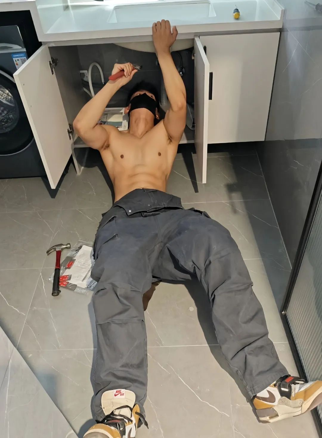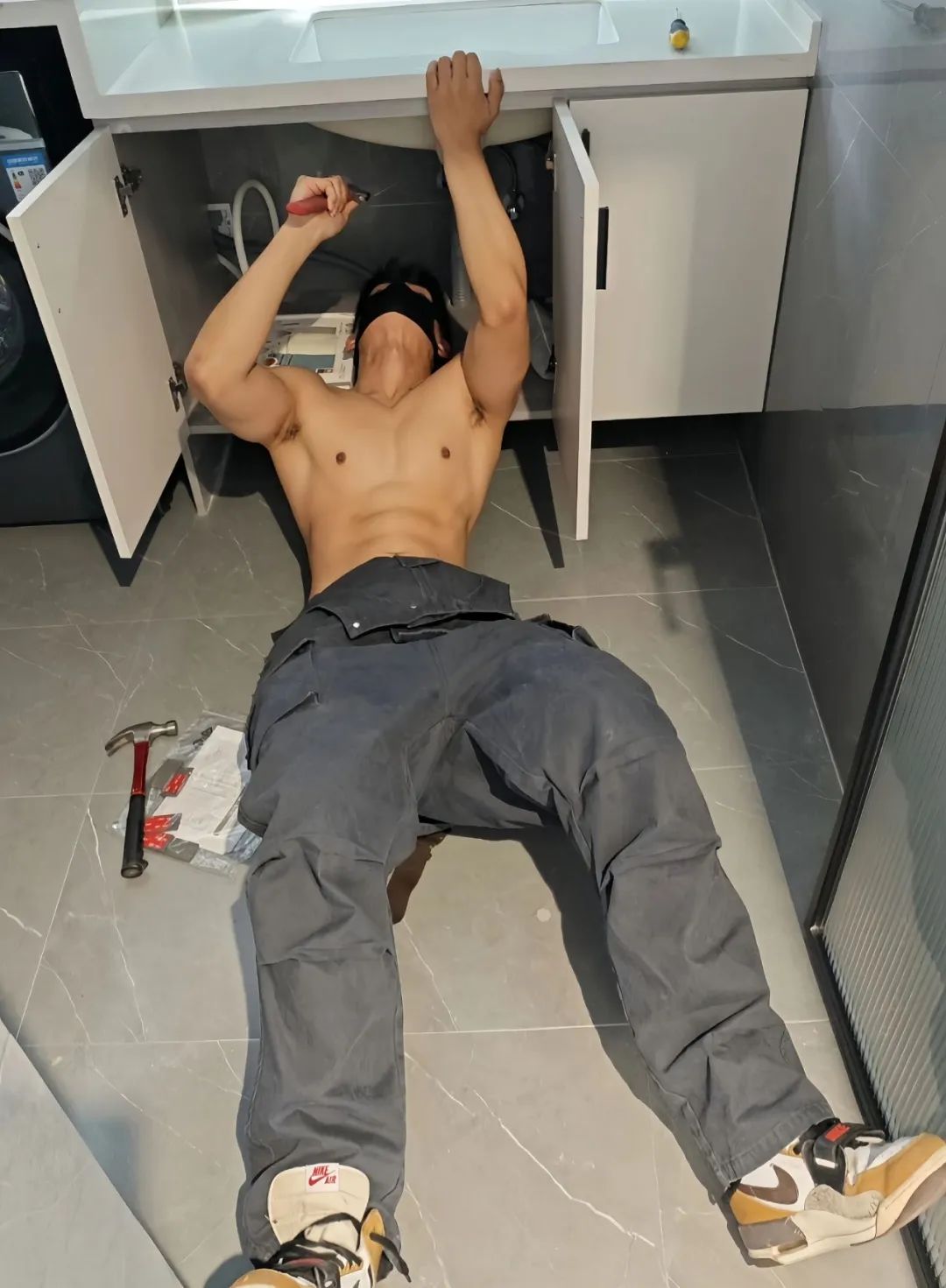水电工衣服湿了,露出完美肌肉身材!
