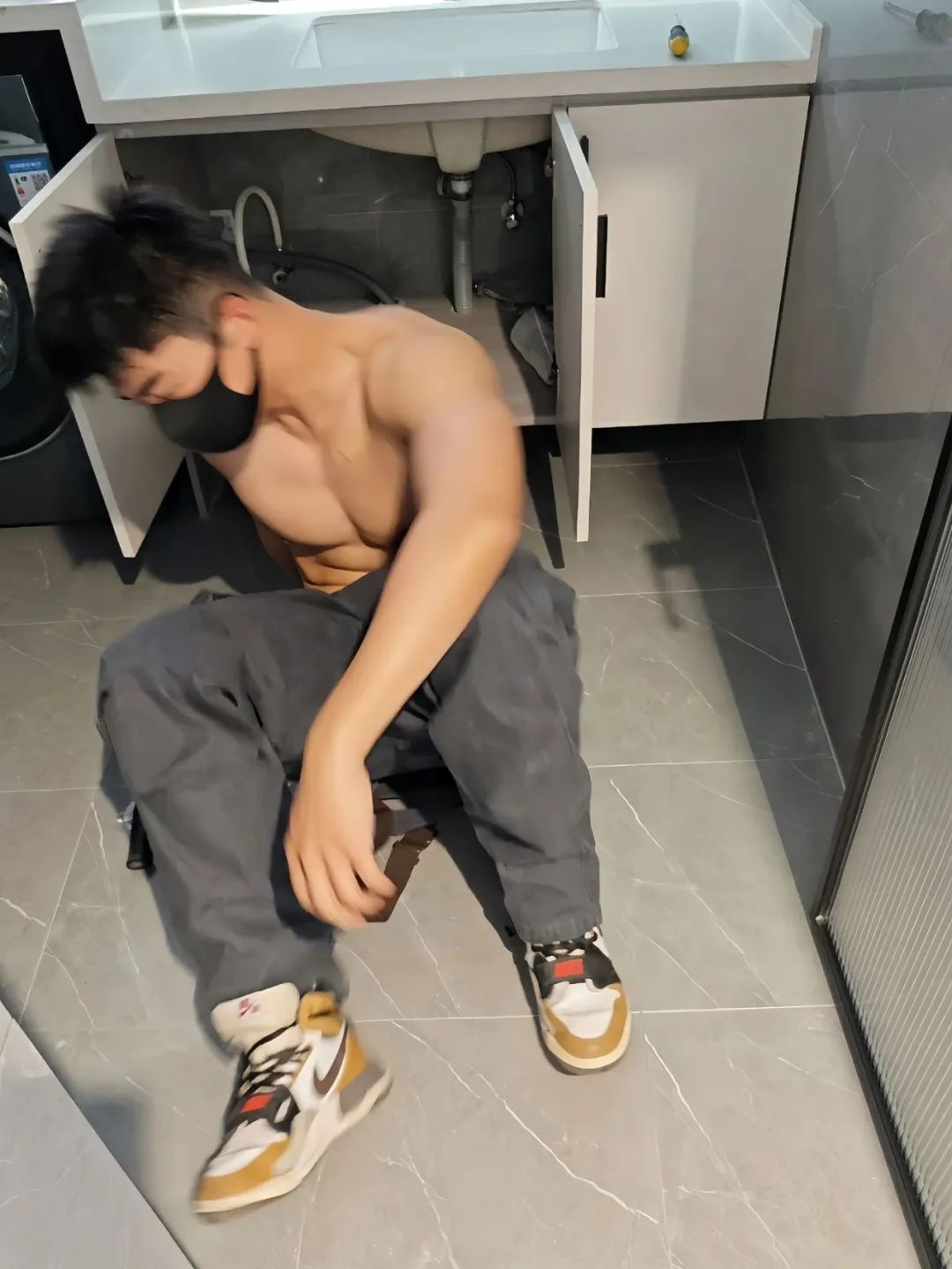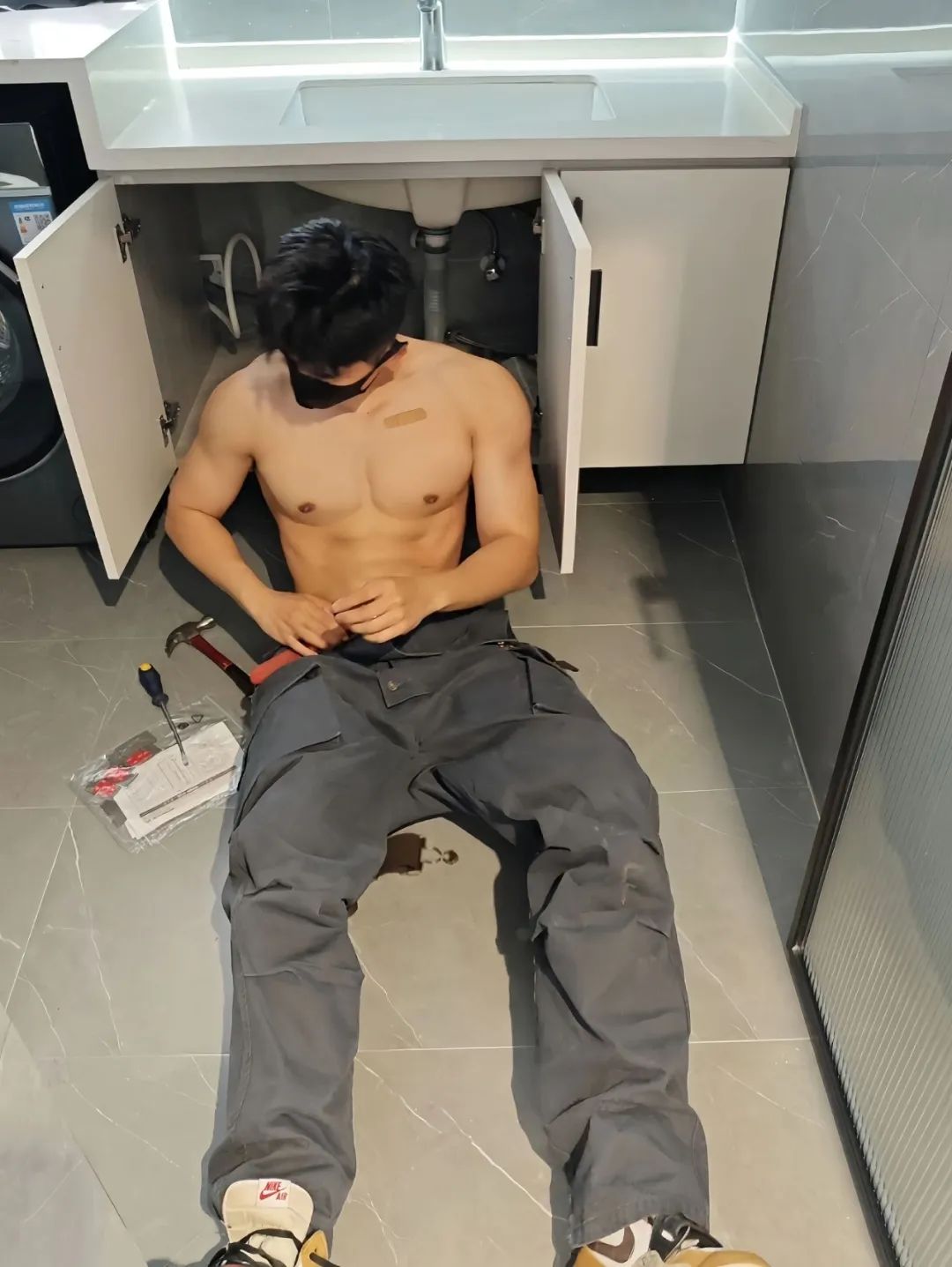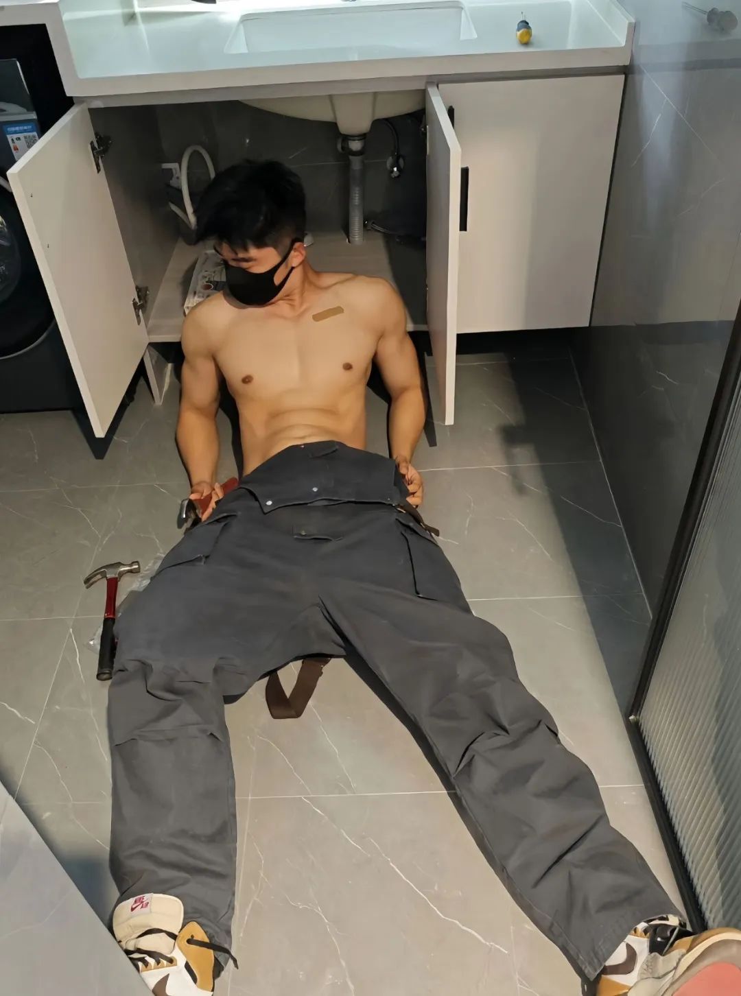 今天小飞遇到了一件既意外又让人心动的小插曲。原本只是请来一位水电工修水管,谁知途中他衣服不小心被水弄湿了。就在那一瞬间,他竟然脱下了湿透的衣服,露出了一副极具魅力的肌肉身材。那健硕的小胸肌和明显的腹肌瞬间抓住了我的眼球,让人不由自主地停下脚步细细欣赏。