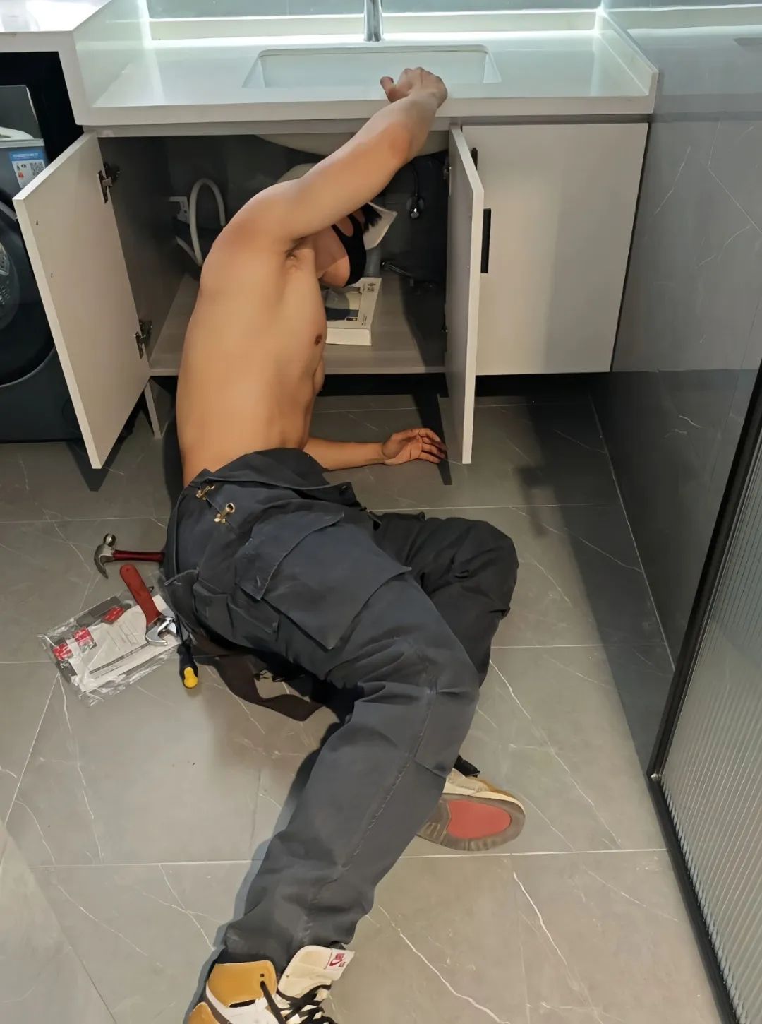 当他专心致志地躺在地上修理水管时,整个场景竟有种独特的男性美感。水电工那精致而结实的身形仿佛一件精雕细琢的艺术品,每一处线条都透露出力量与男性张力。看着他专注的神情,我突然觉得日常生活中的小意外也能带来不经意间的美丽惊喜。