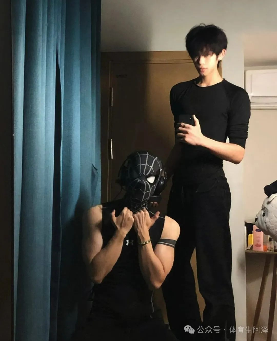 而且第二张这个跪下来的姿势太飒了,蒙面蜘蛛侠的头套加上这个超有力量感的大臂肌肉。阿泽彻底被他给征服了,感觉就像影视剧里的男主一样。怎么会有这么完美的人啊!