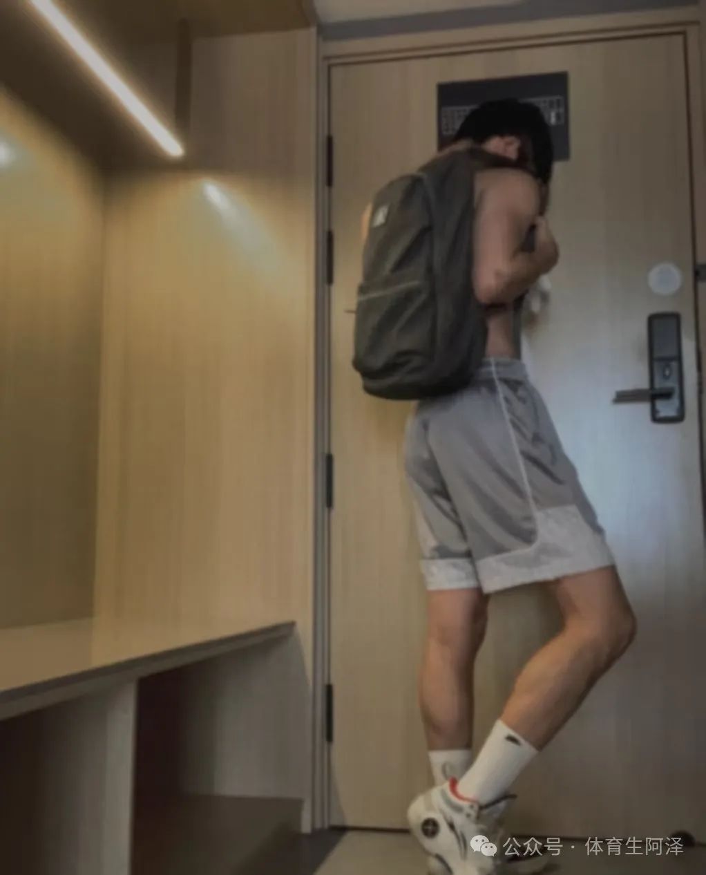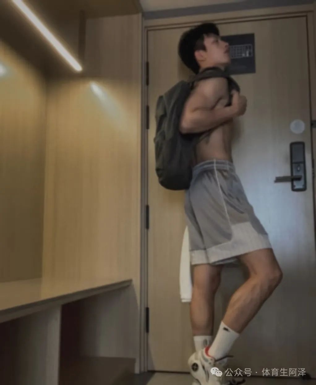 还有这张照片,完全是体育生的穿搭,不仅是篮球鞋还是短裤双肩包,无不透露出体育生那浓浓的荷尔蒙。再加上这个充满力量感的肌肉线条,小腿鼓起来的肌肉令人着迷。